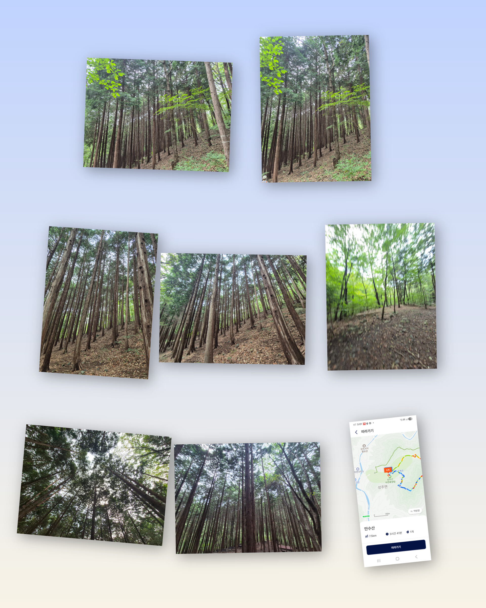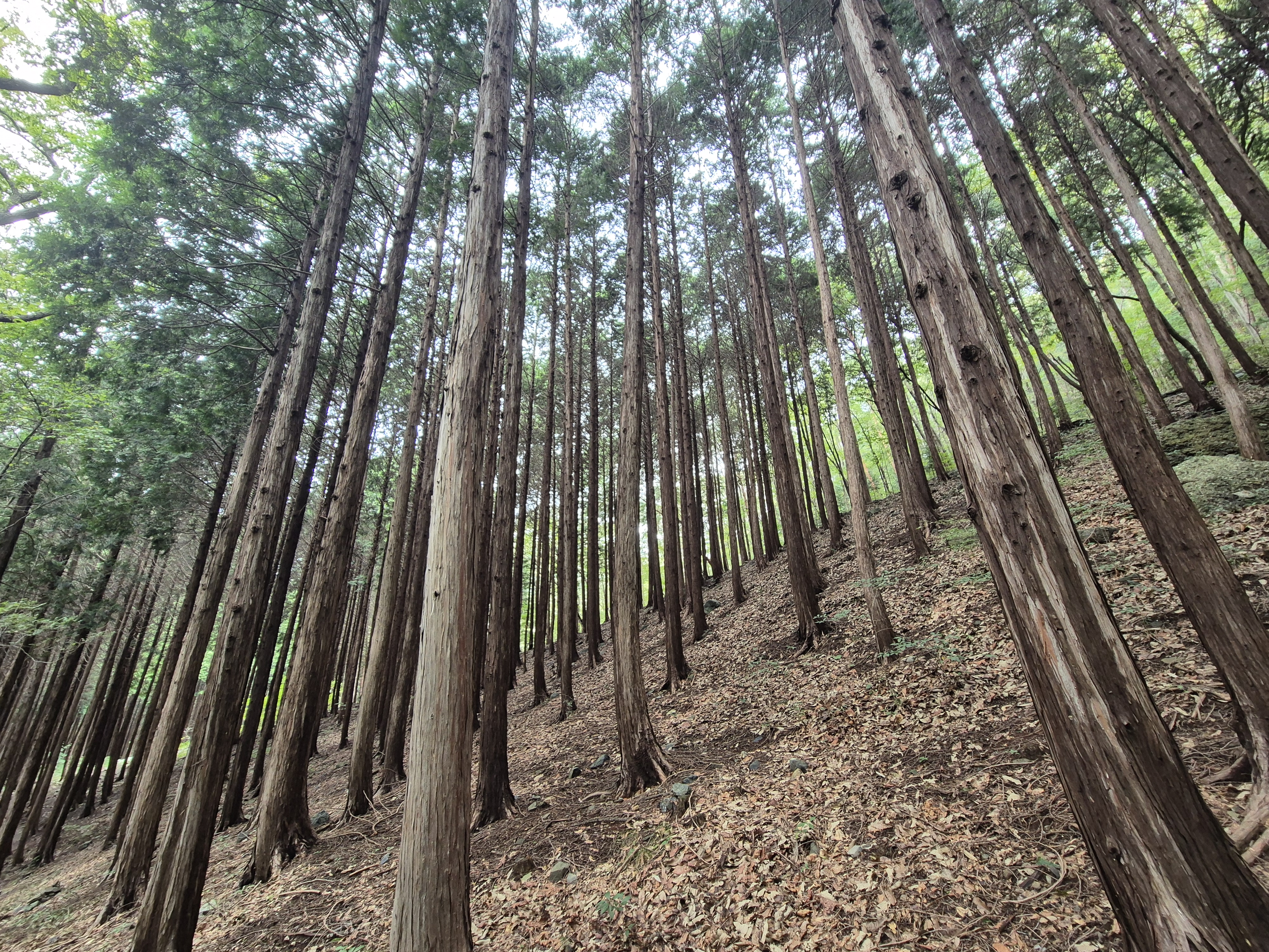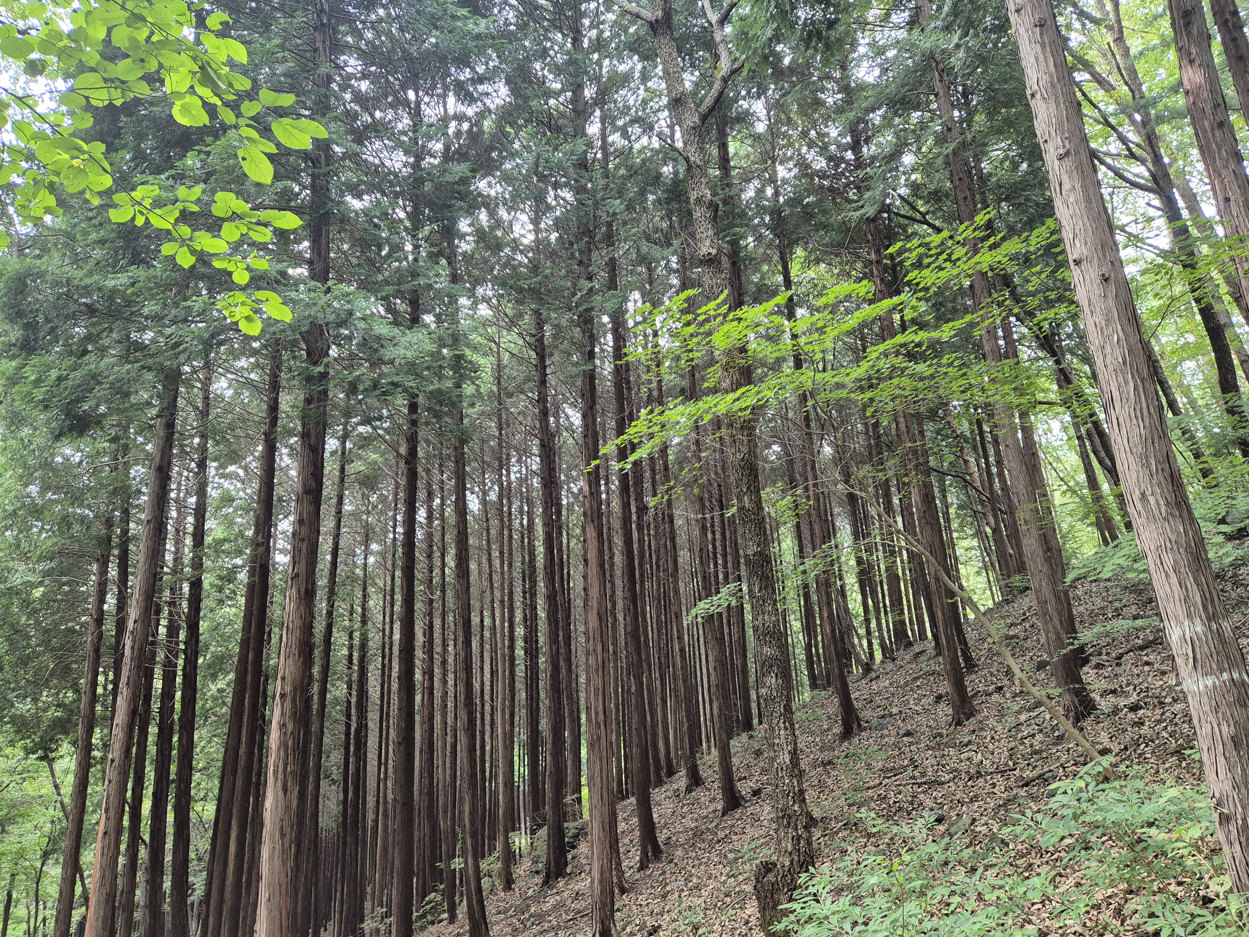 땀에 젖을 무렵 편백나무숲이 나타나니 거의 하산을 하였다.