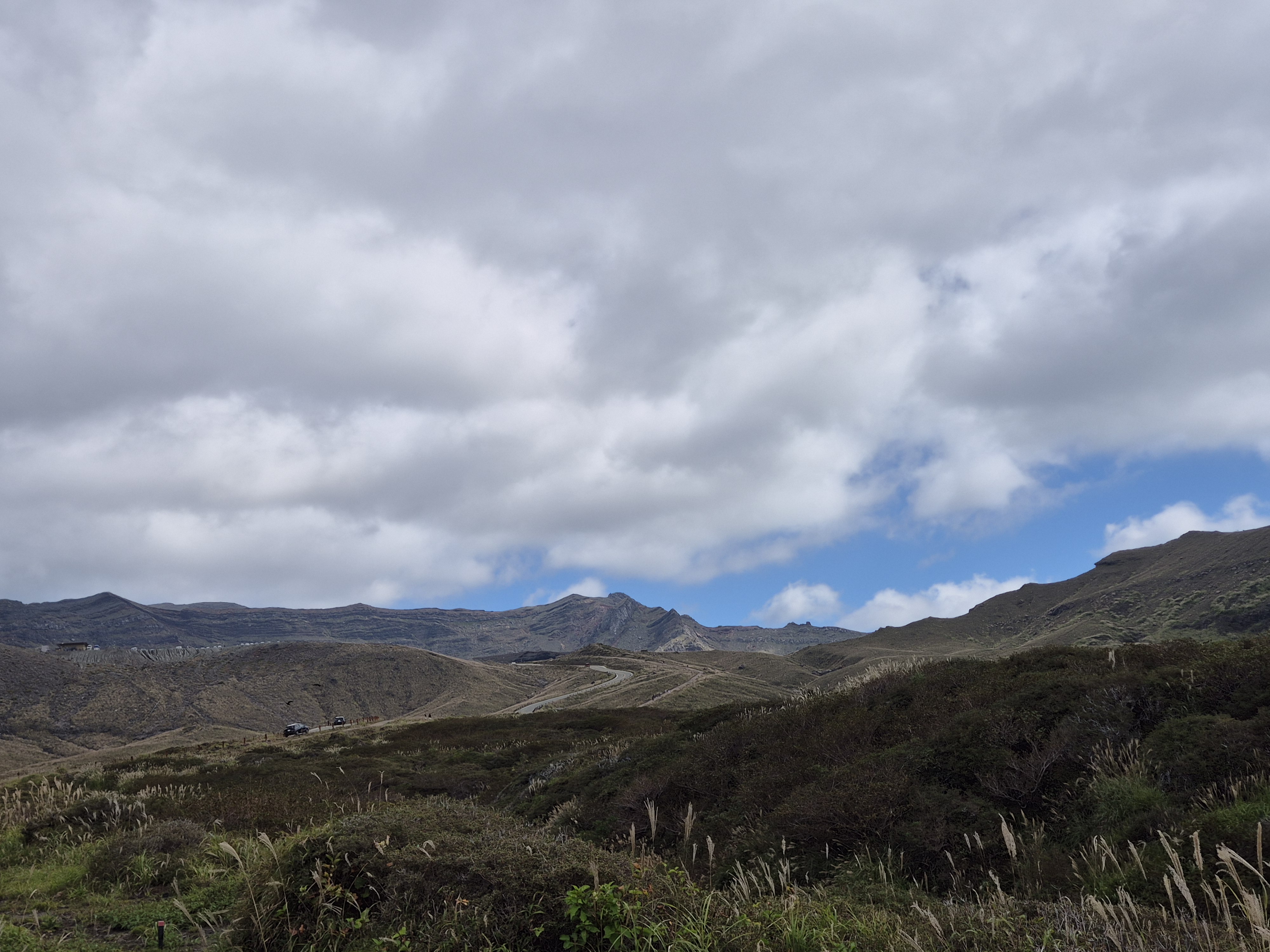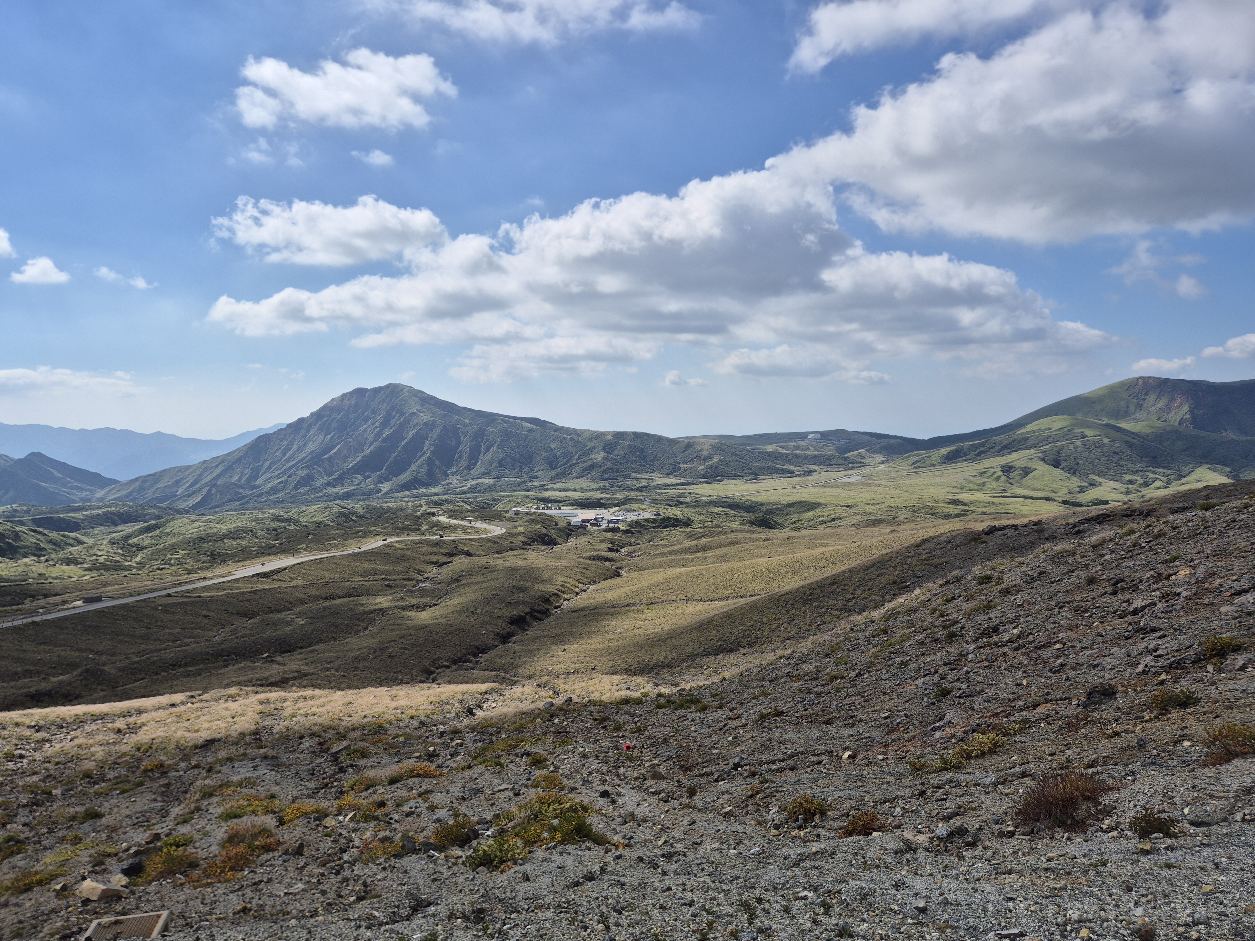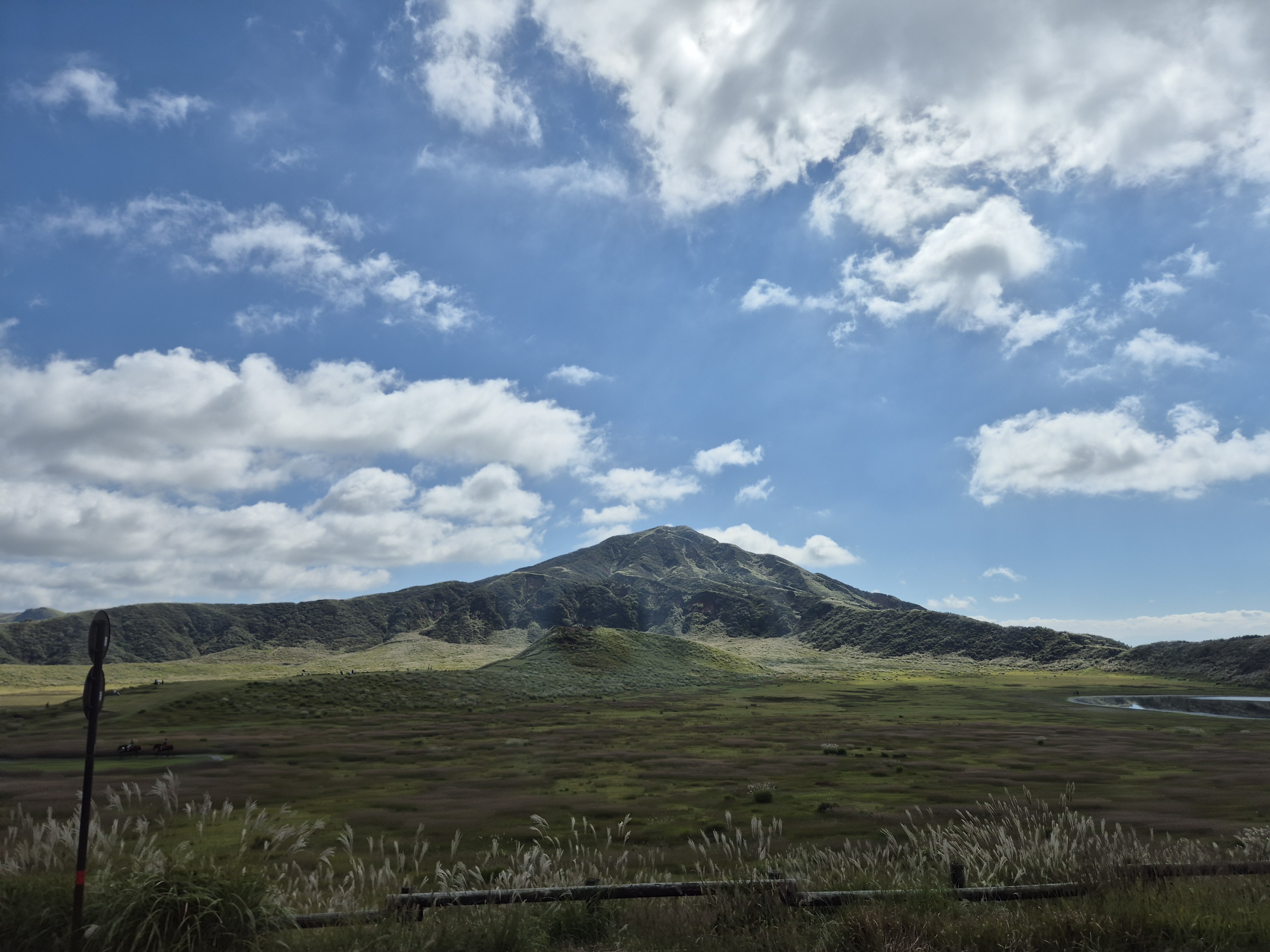 어느사이 초원지대가 나타나며 아소산이 조망이 된다.