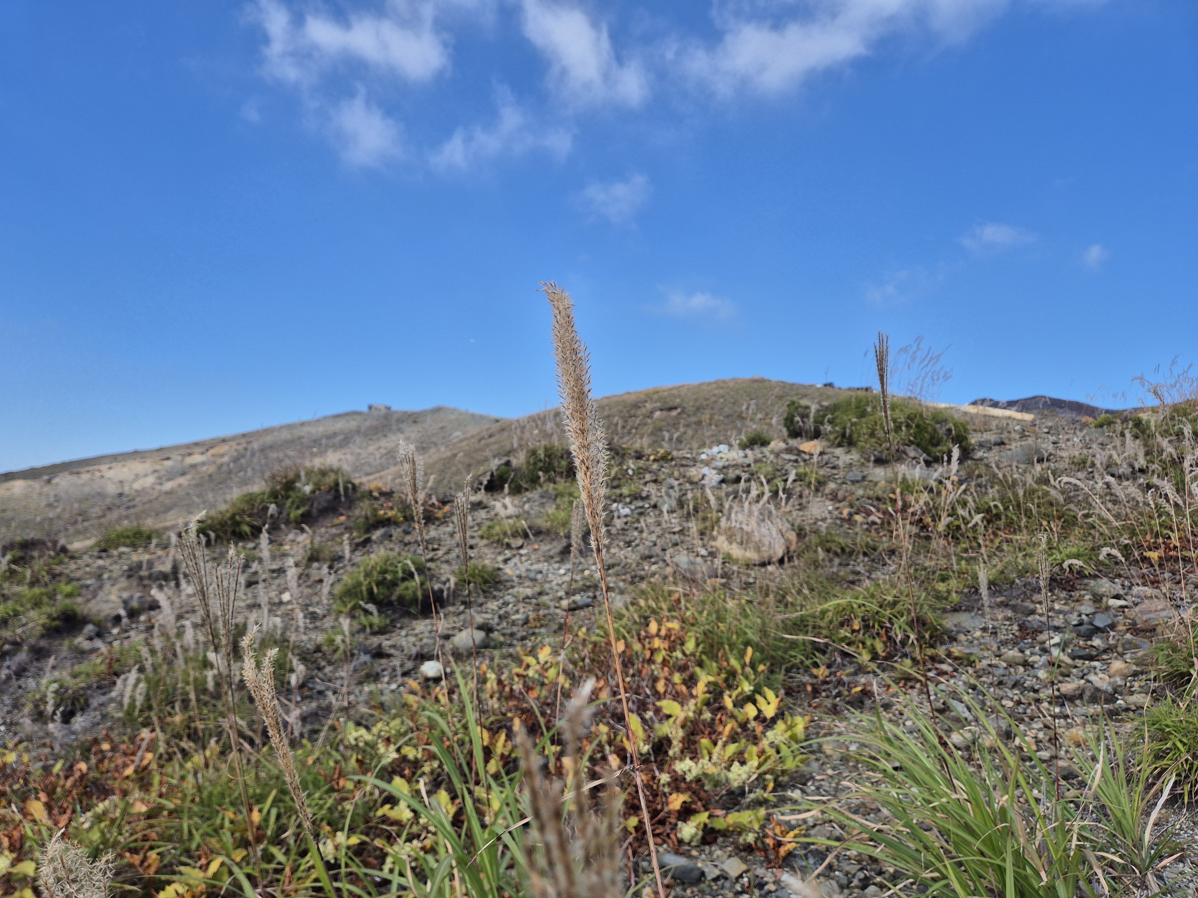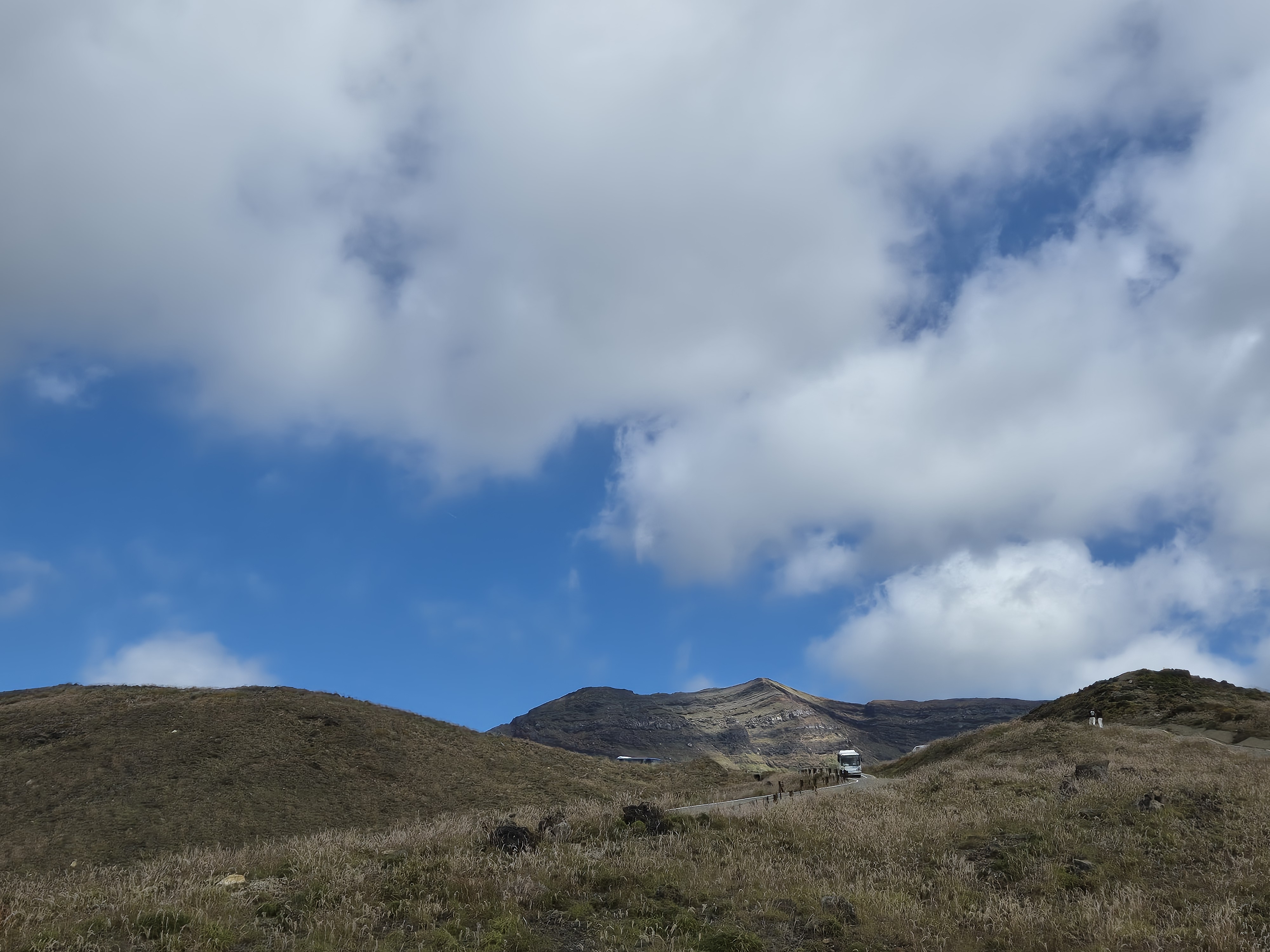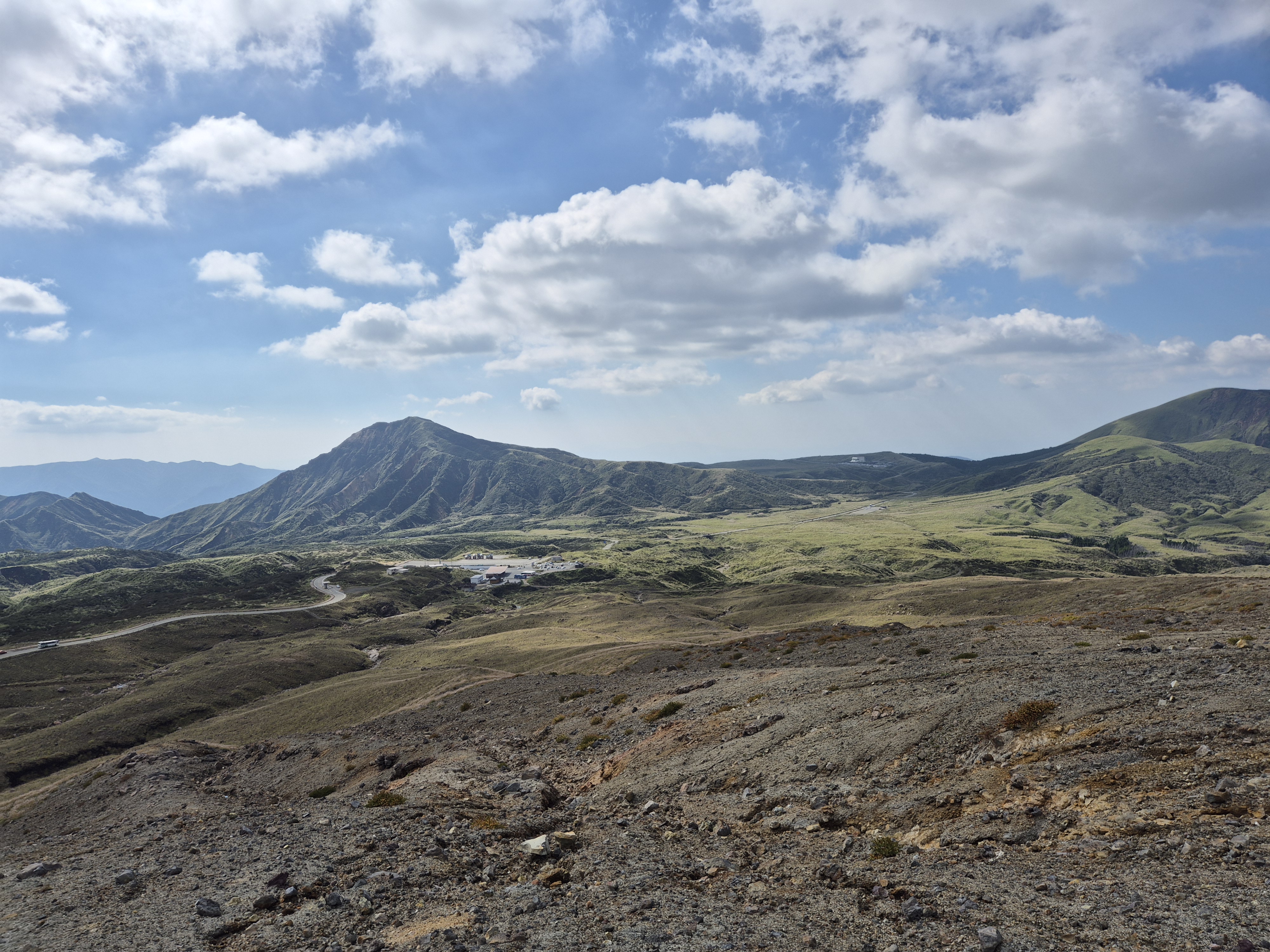 어느사이 초원지대가 나타나며 아소산이 조망이 된다.