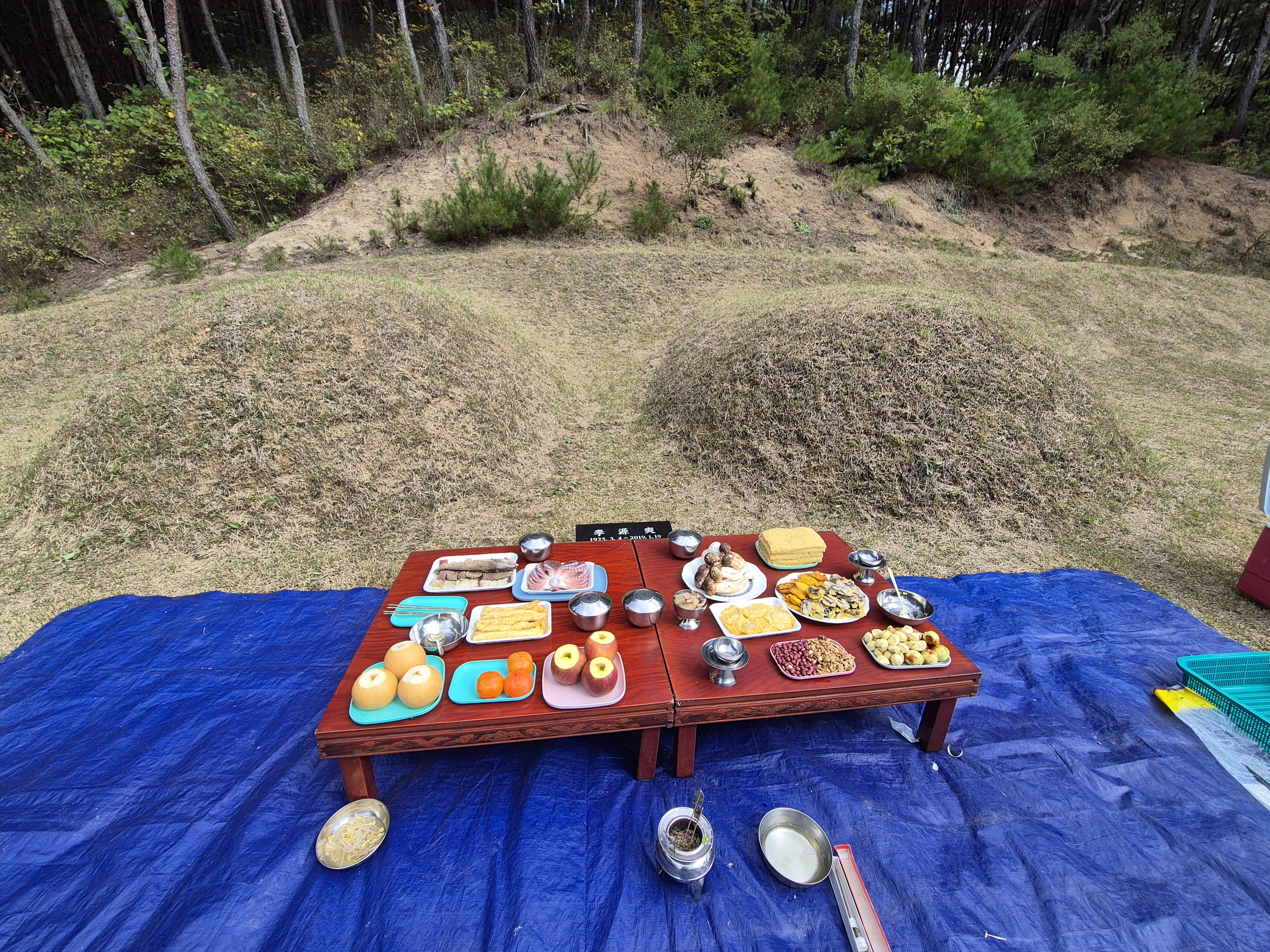 그리고는 다같이 모여 부모님산소에 정성스레 음식을 차려놓고