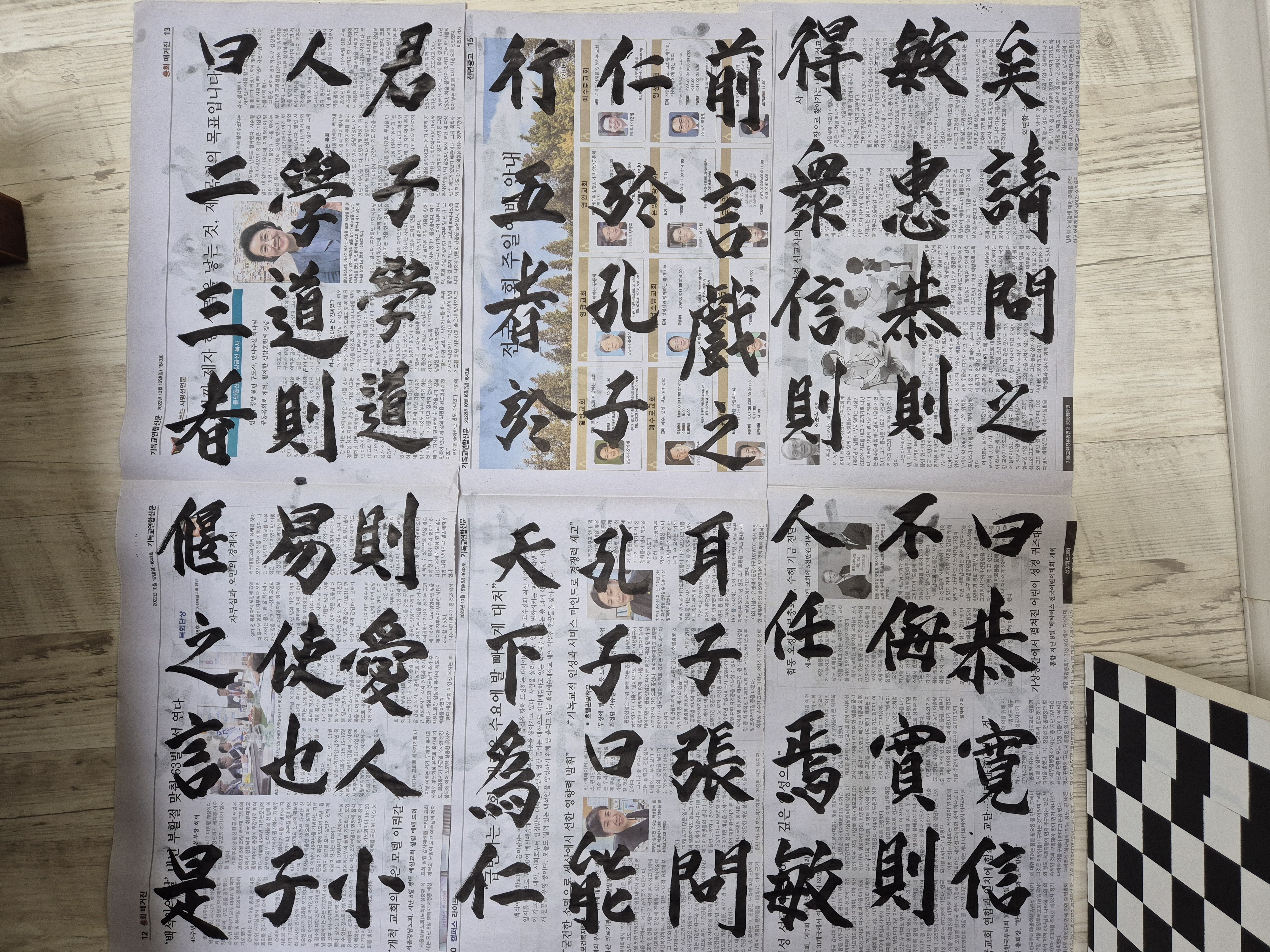 새로이 배운방식으로 화선지가 아닌 신문지에 큼직하게 글씨를 쓰는데,