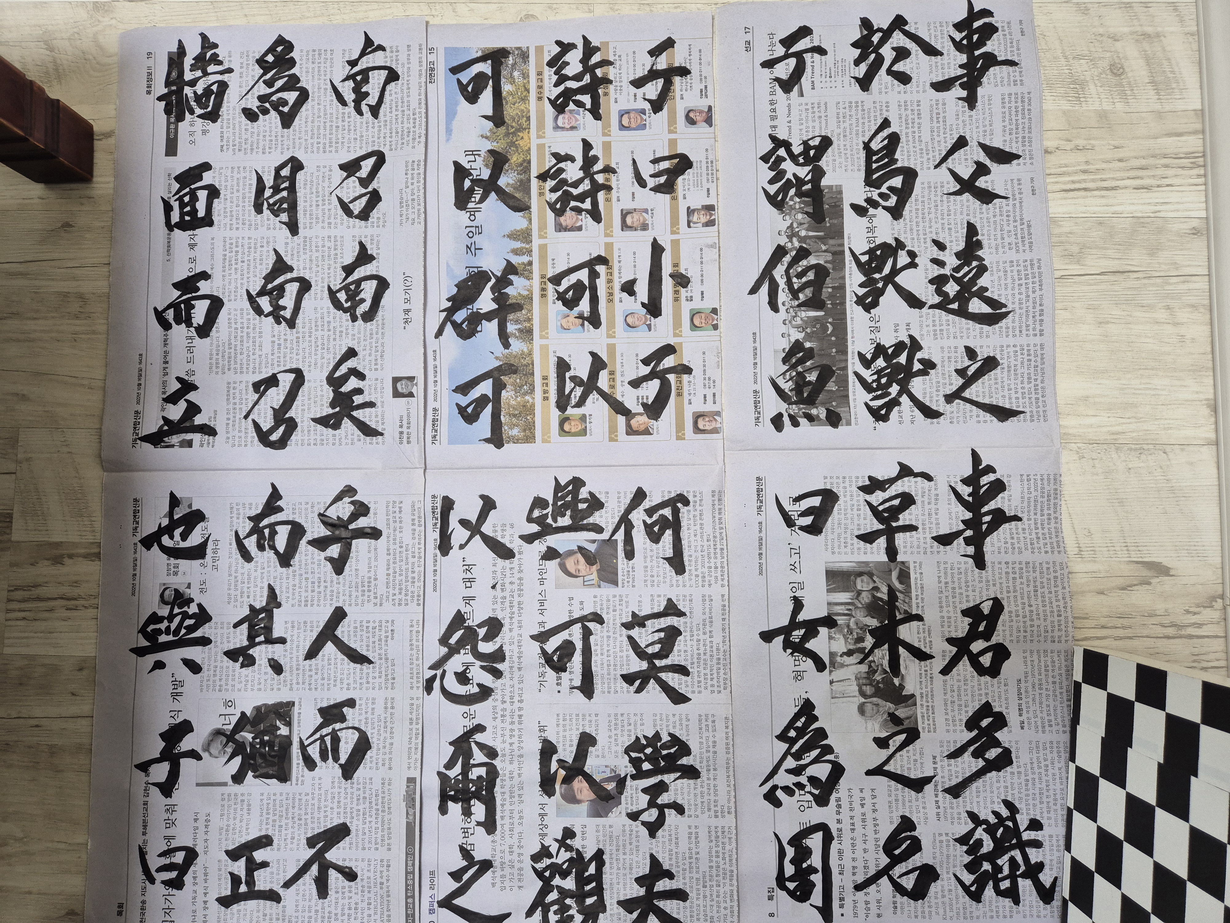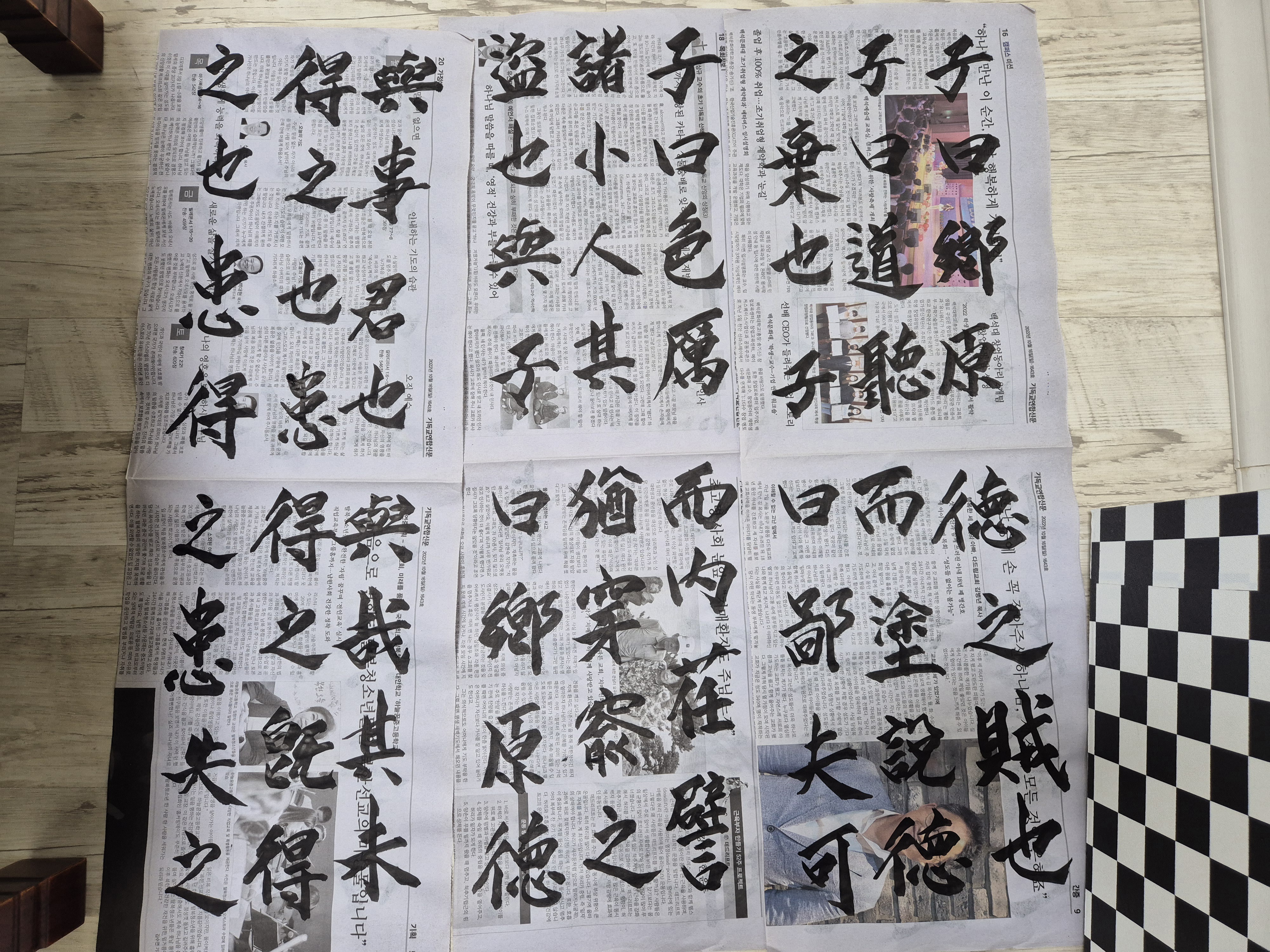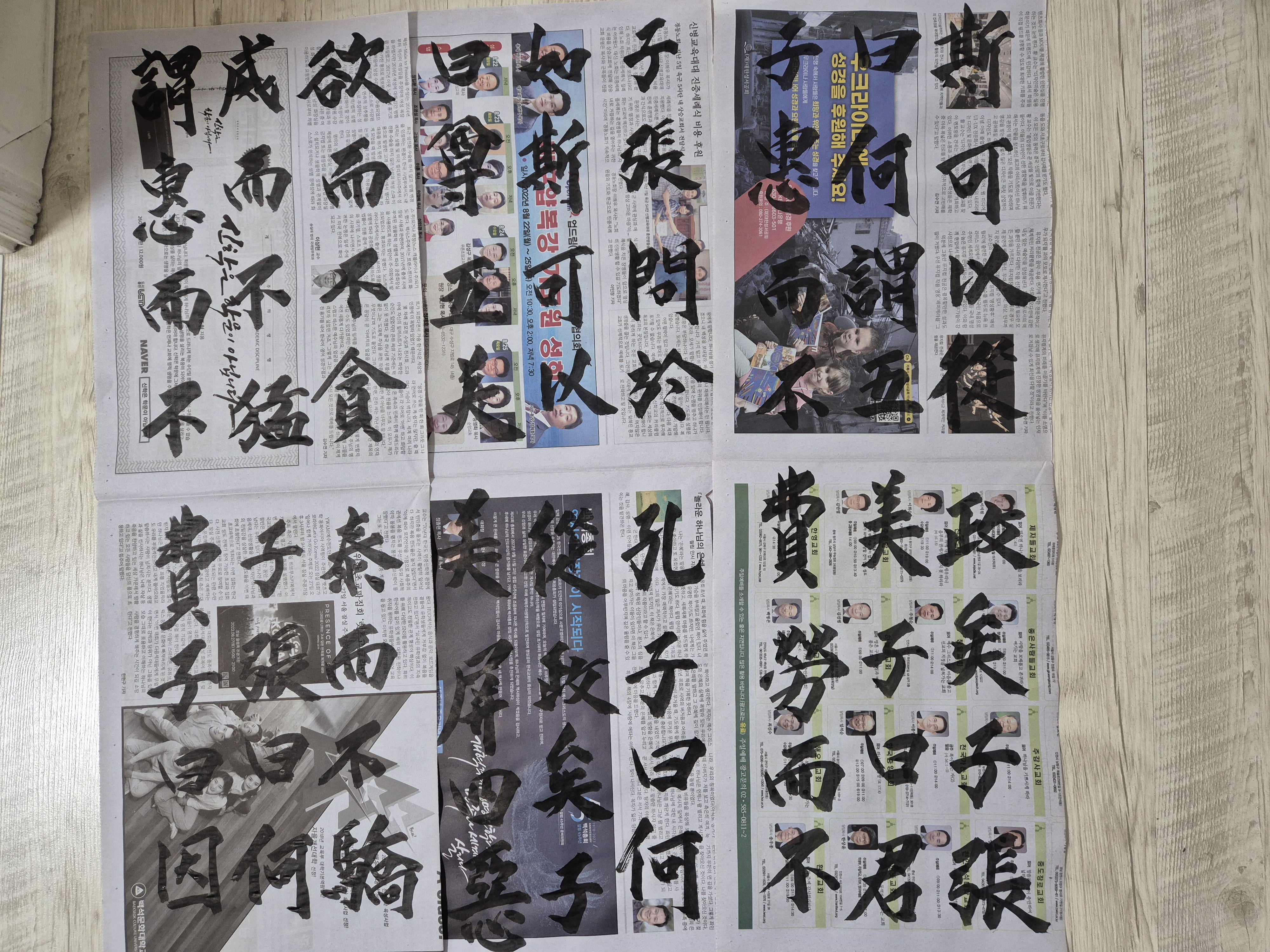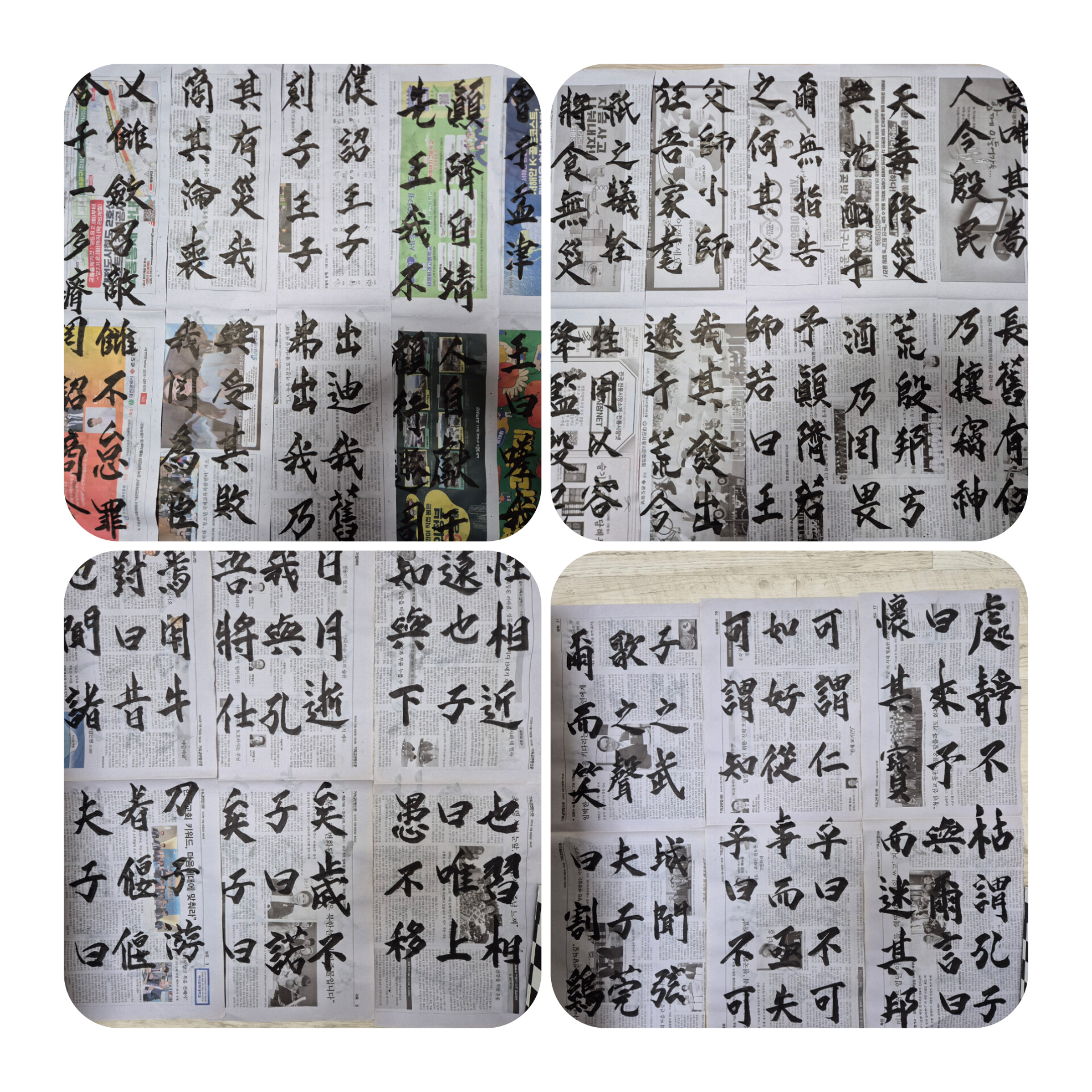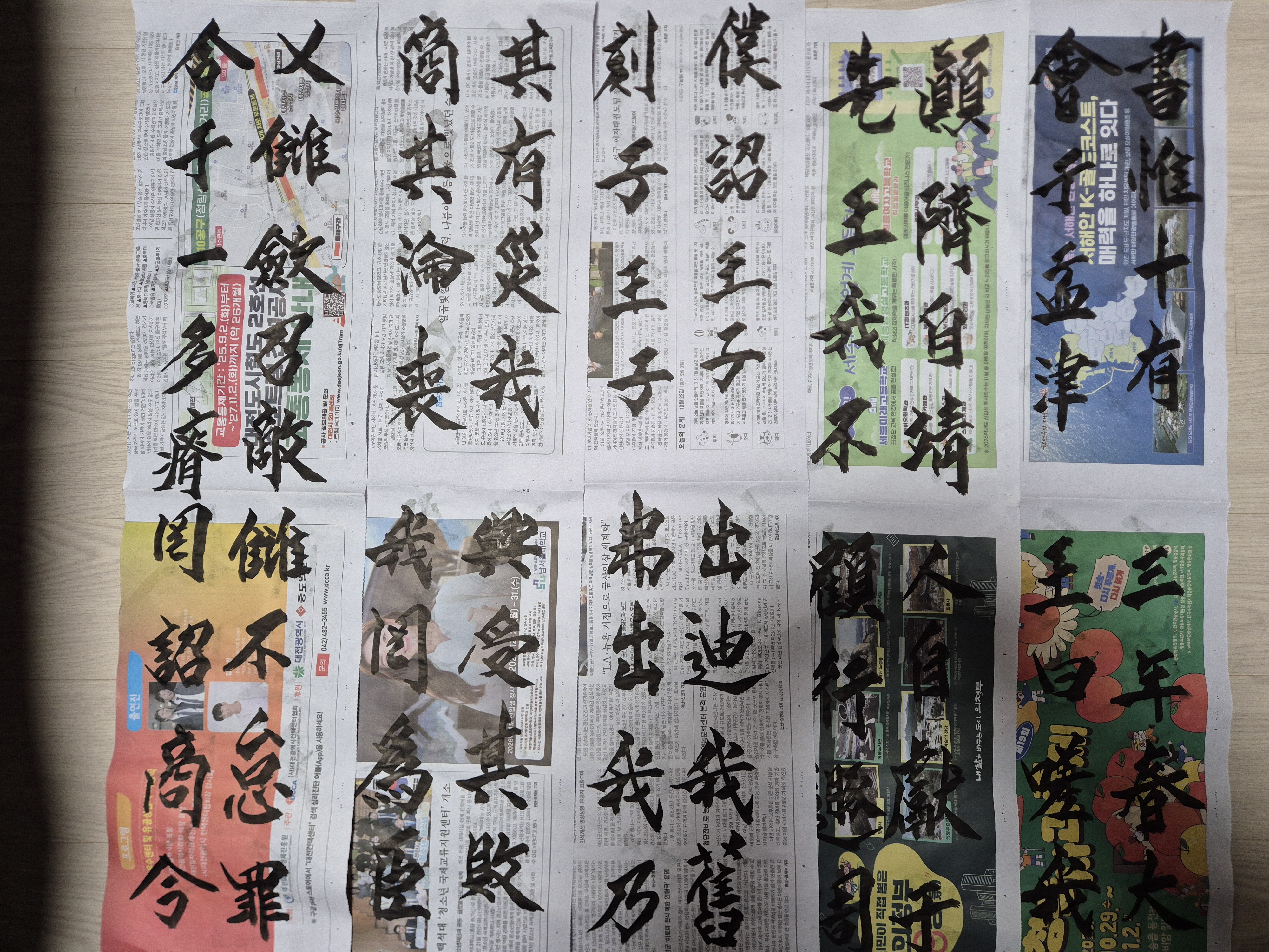 새로이 배운방식으로 화선지가 아닌 신문지에 큼직하게 글씨를 쓰는데,