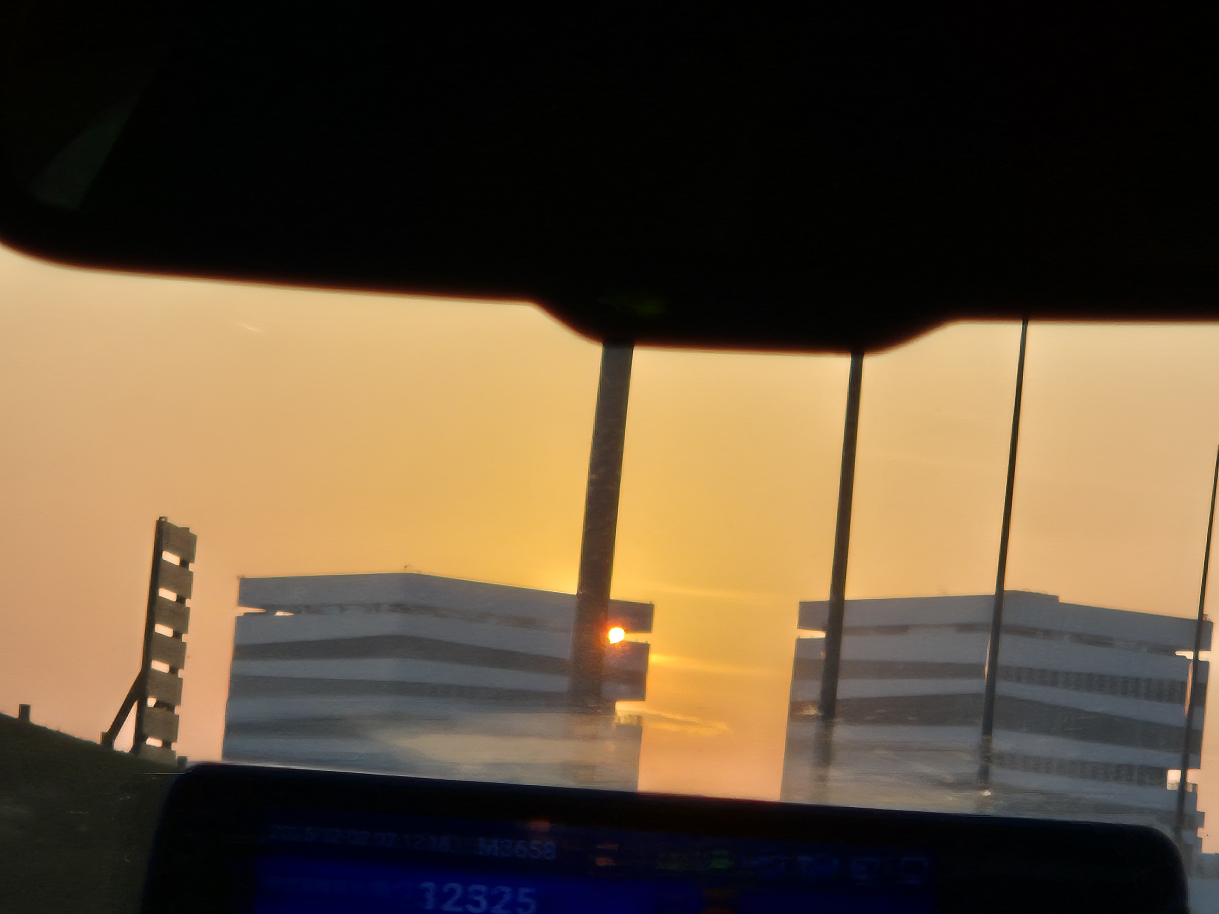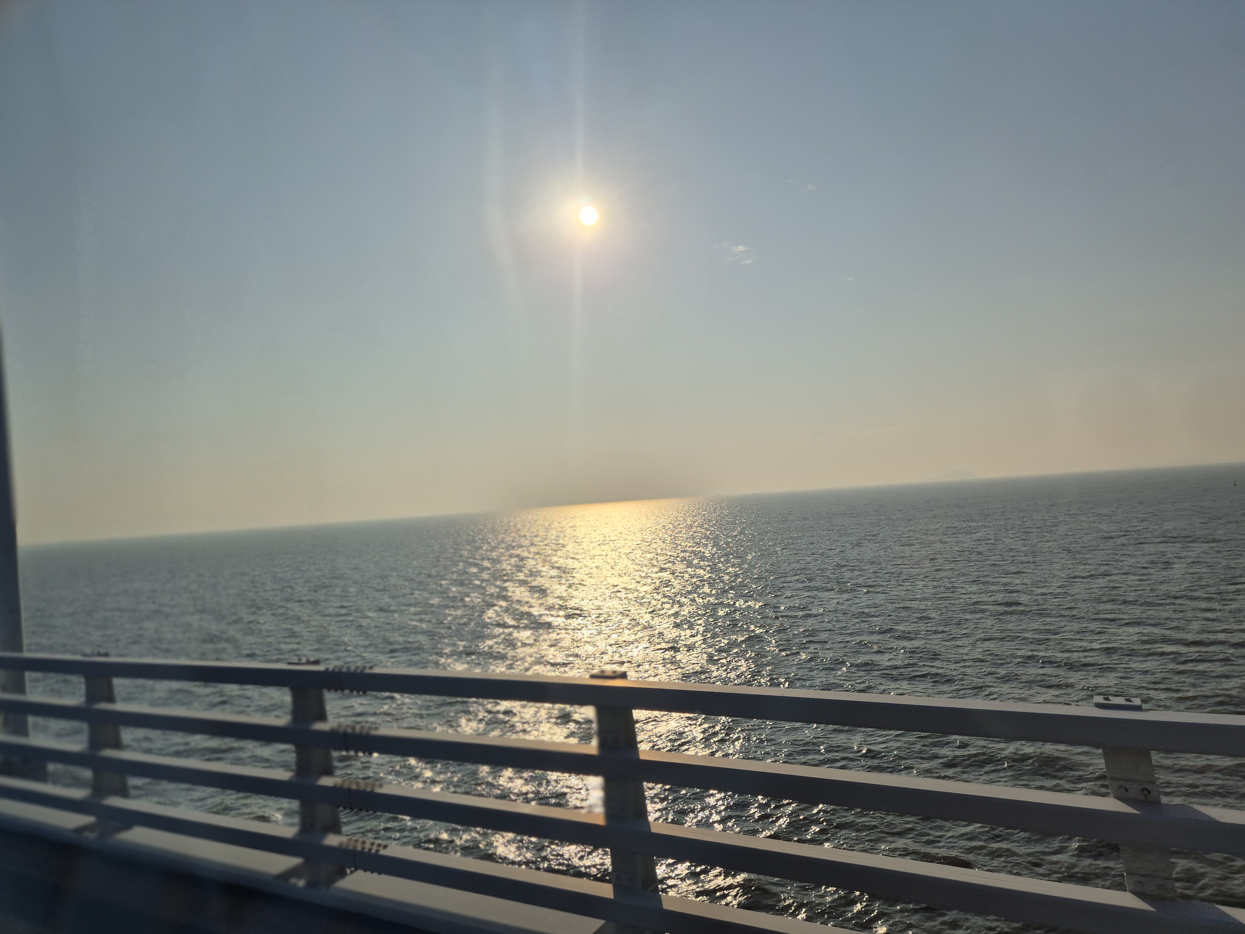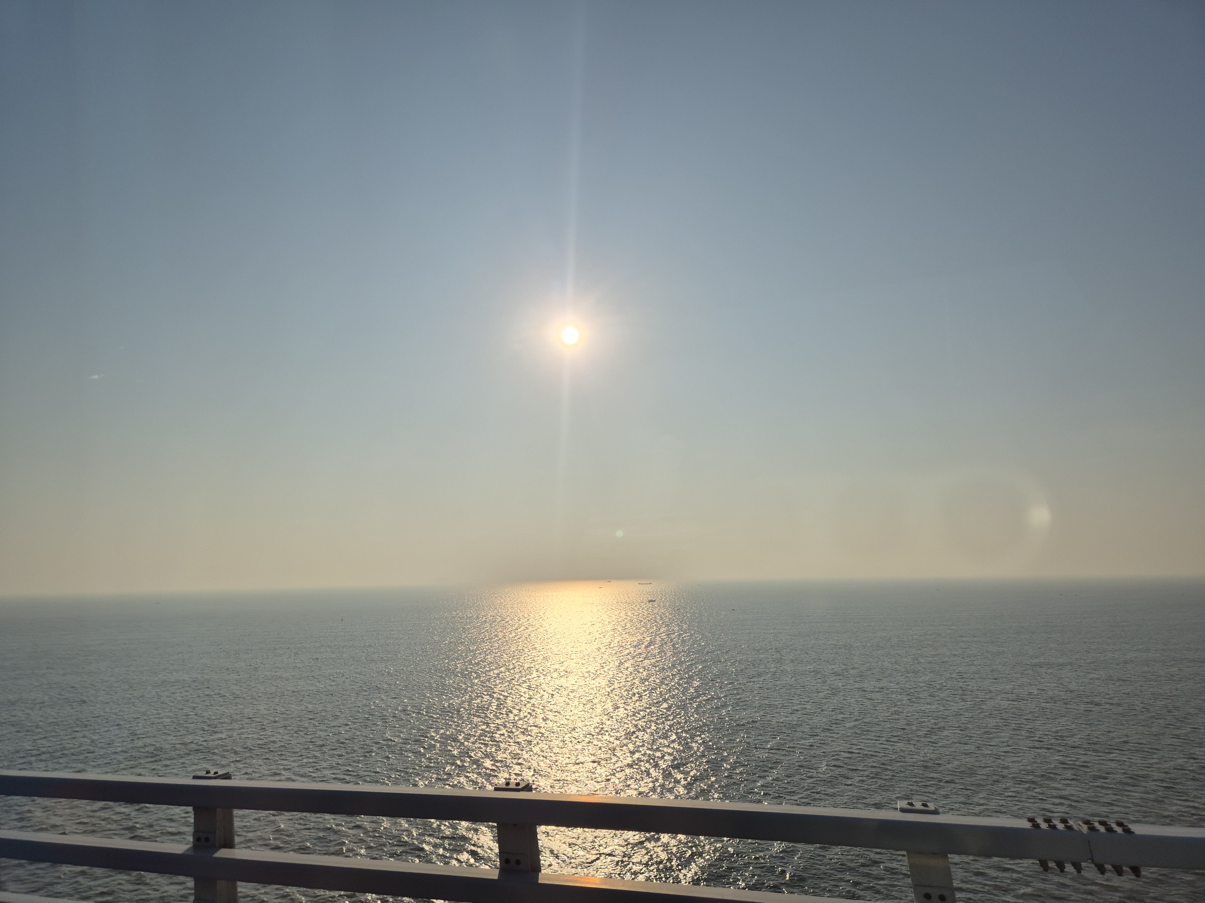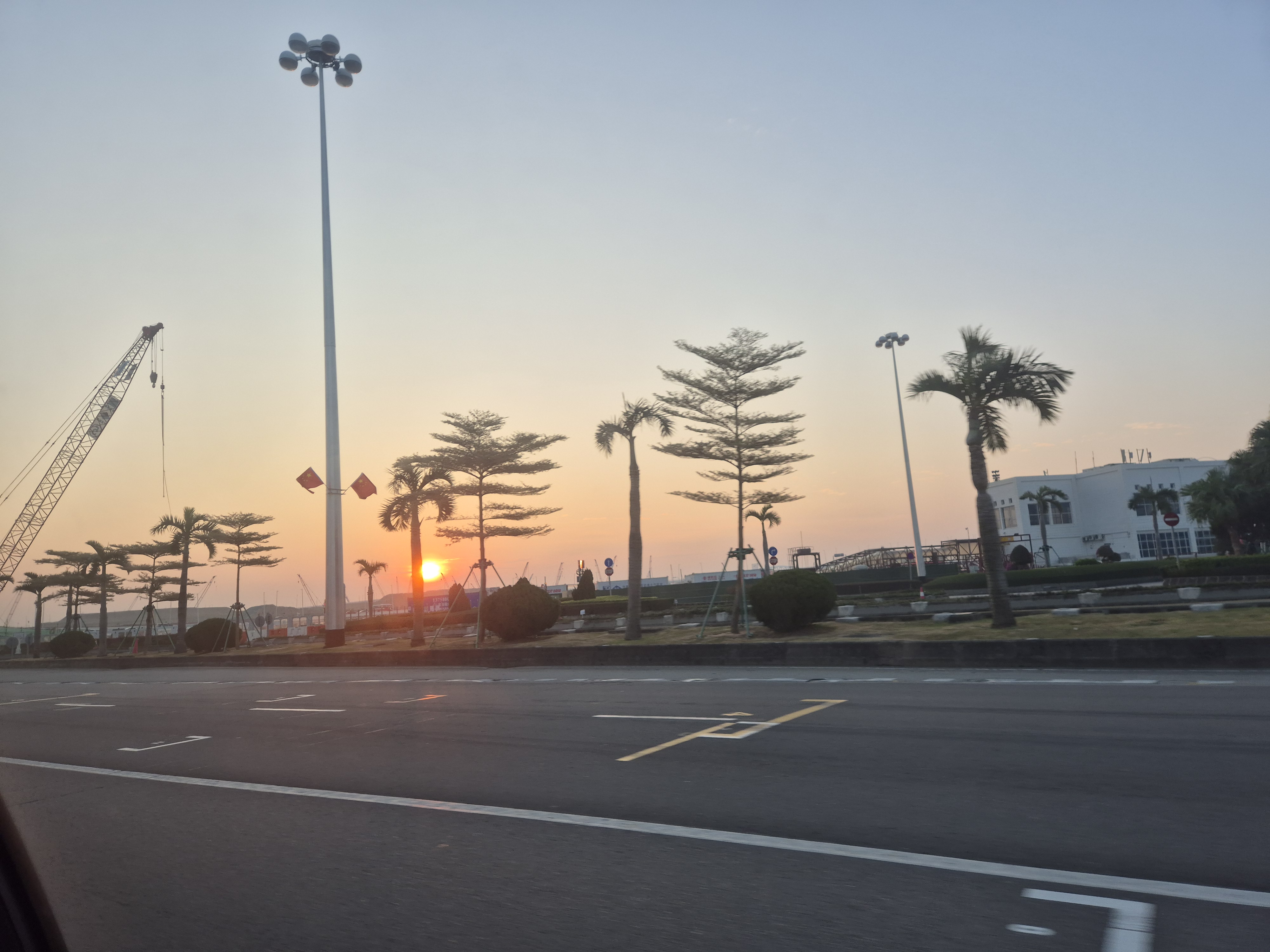 터미날로 달리는 택시에서 바라보는 일출이 강렬하게 바다에서 솟아오른다.