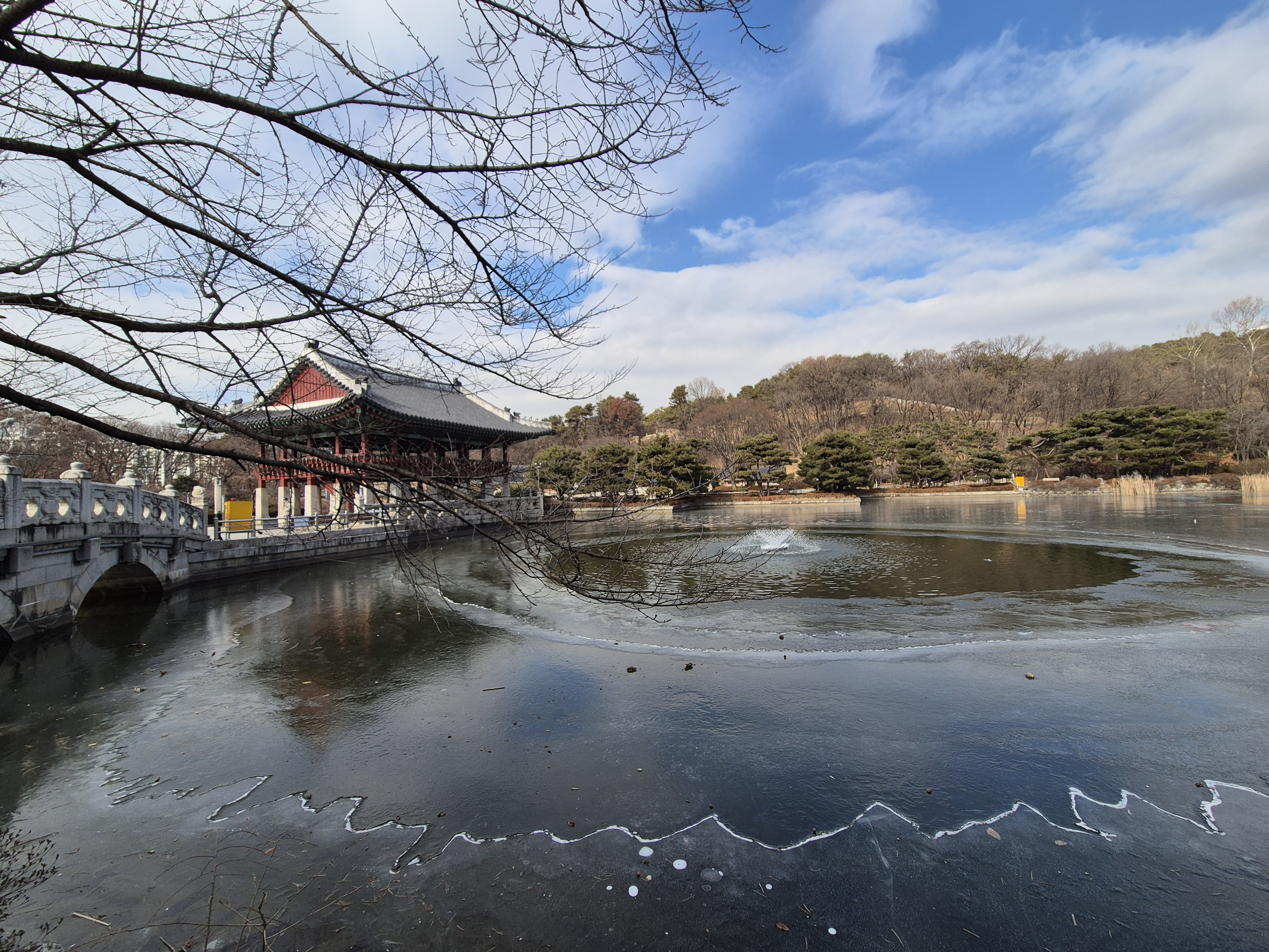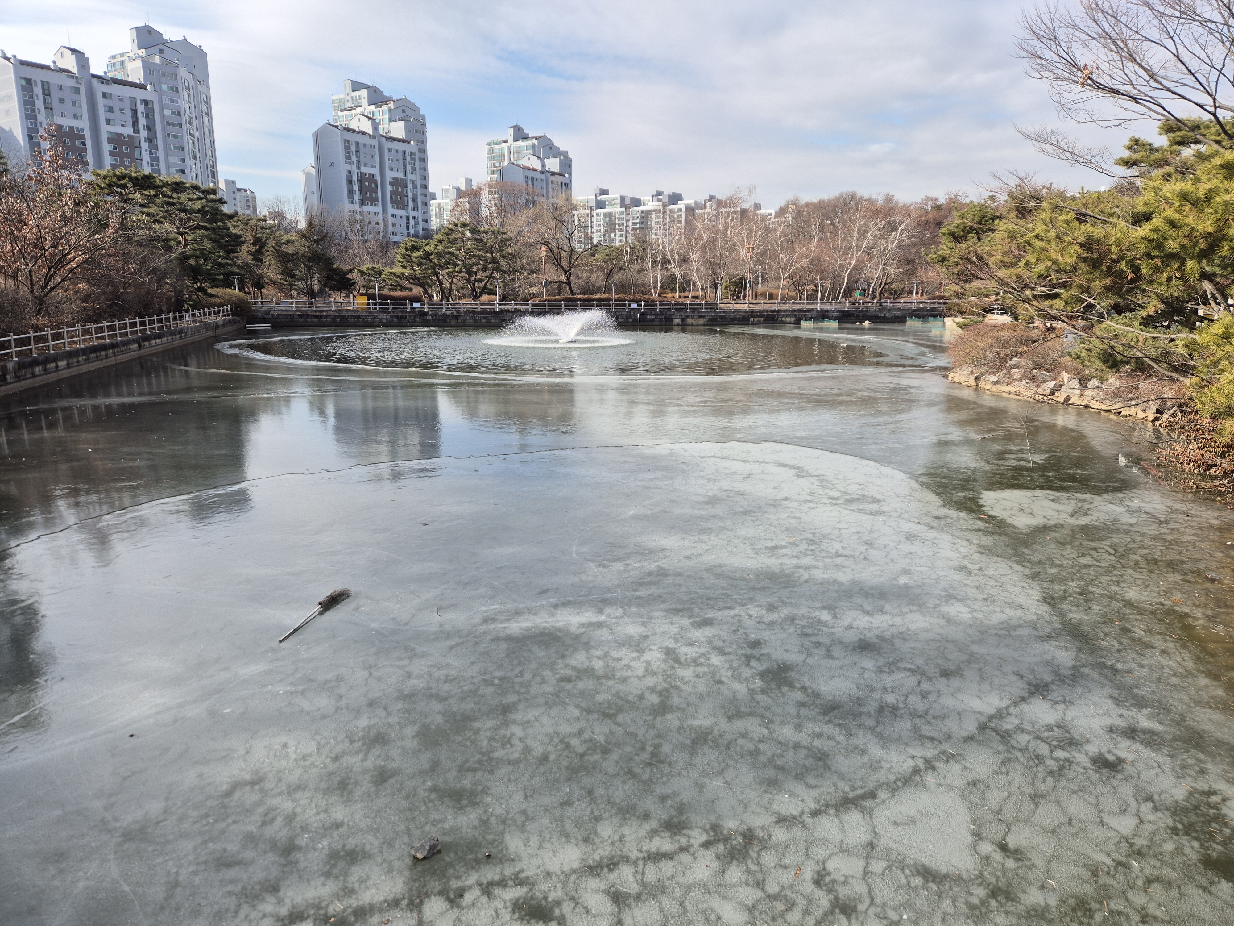 겨울철 공원의 호수는 얼었지만 분수를 가동하여 공기를 순환하여