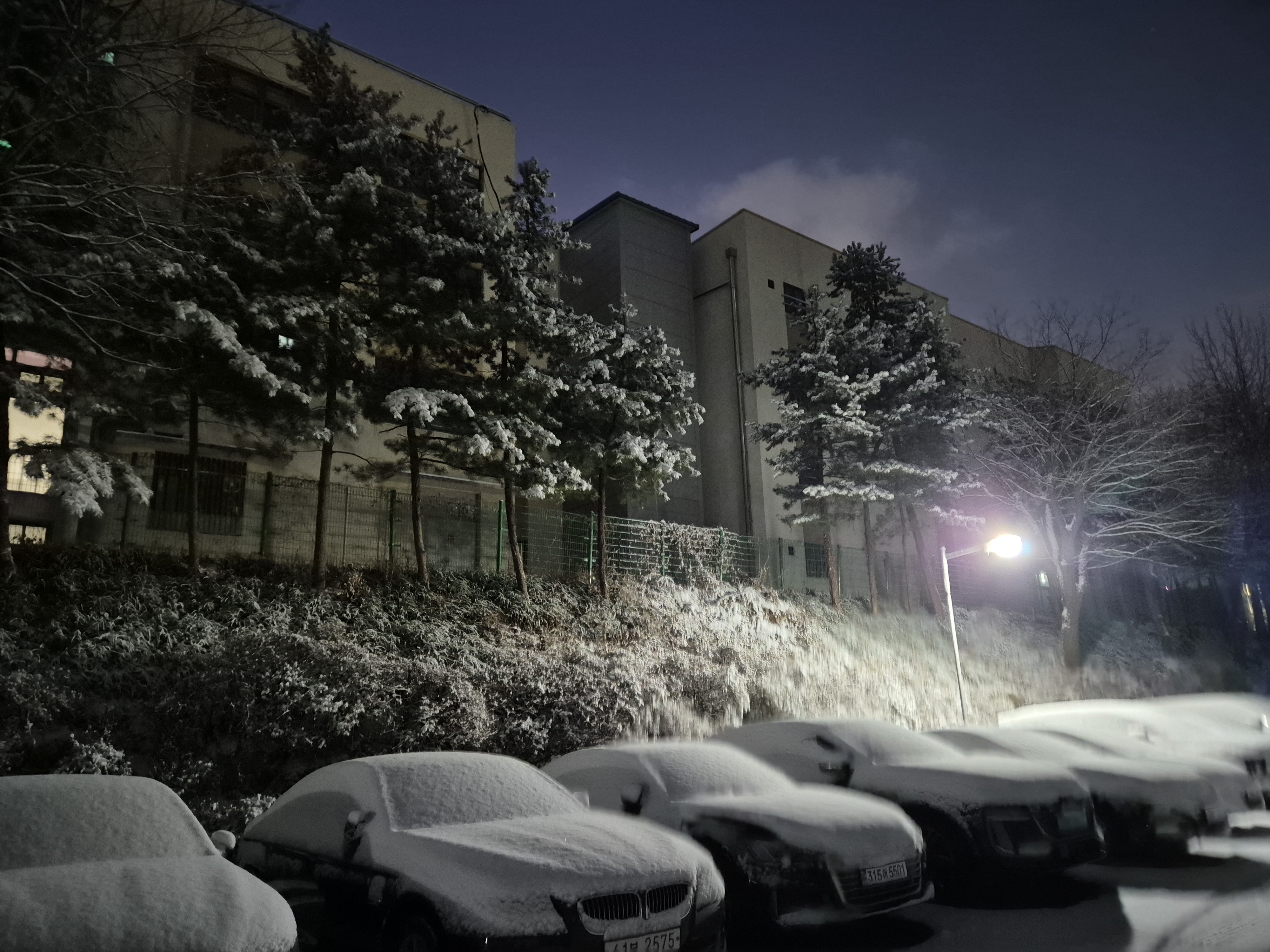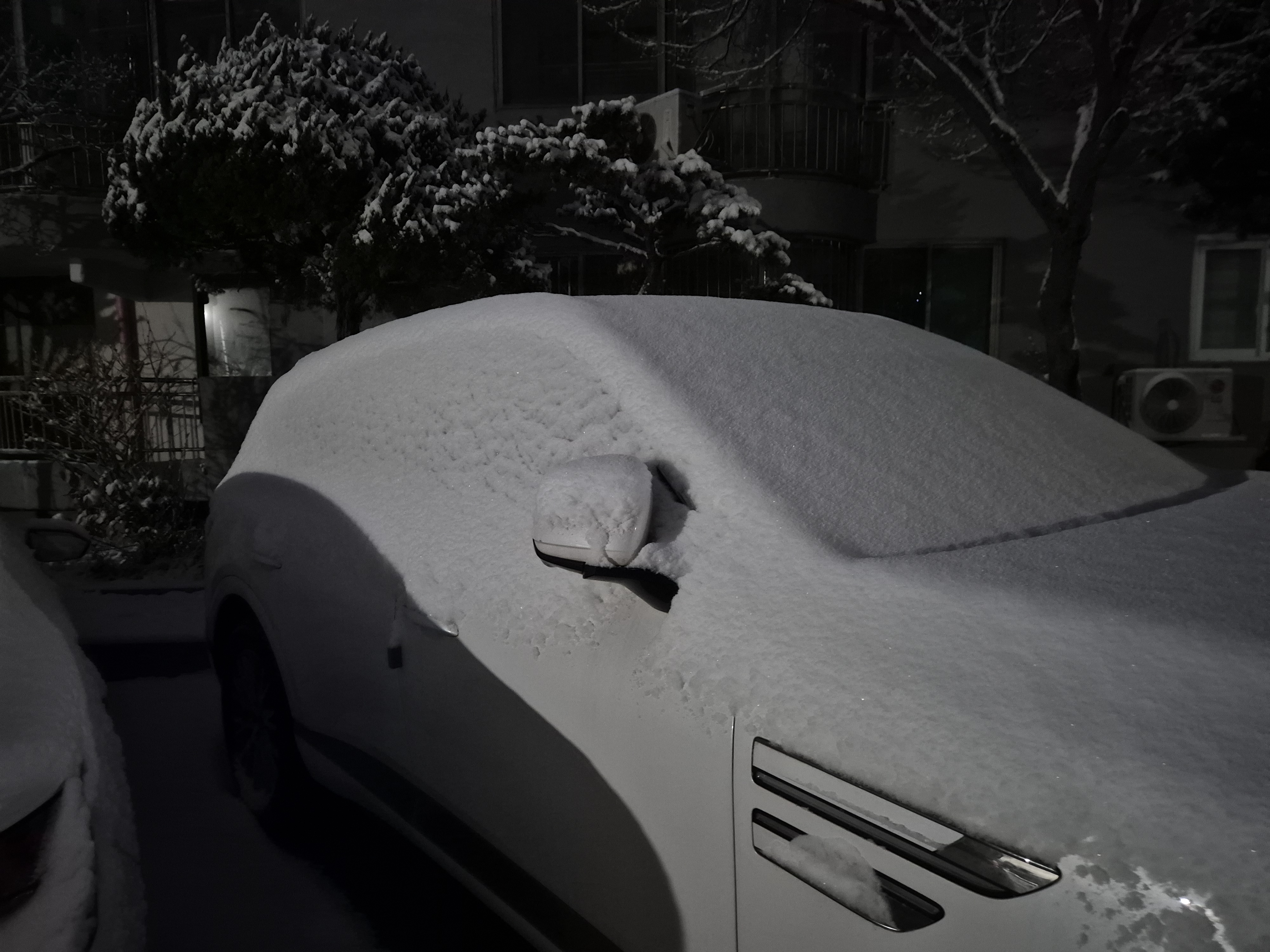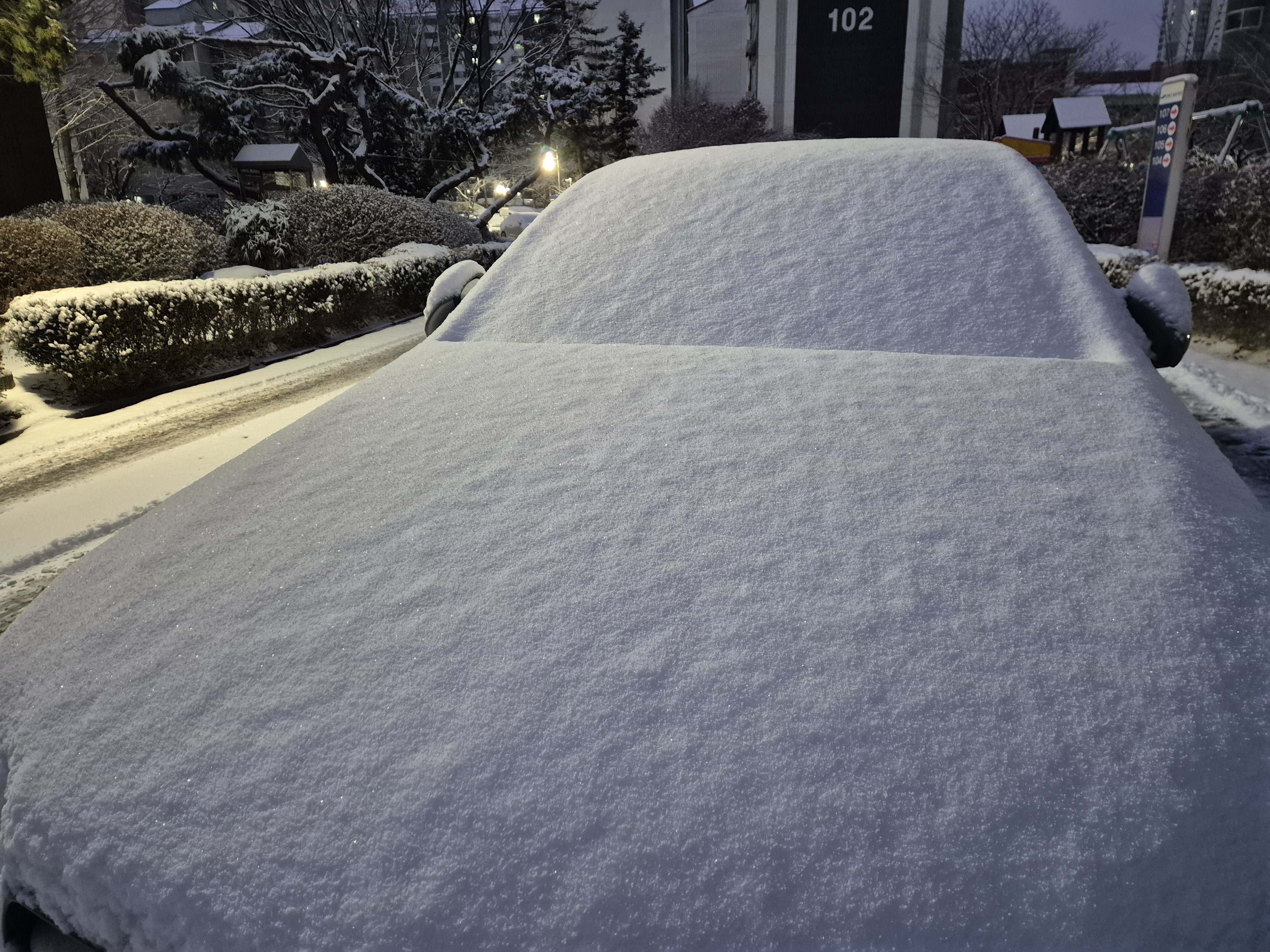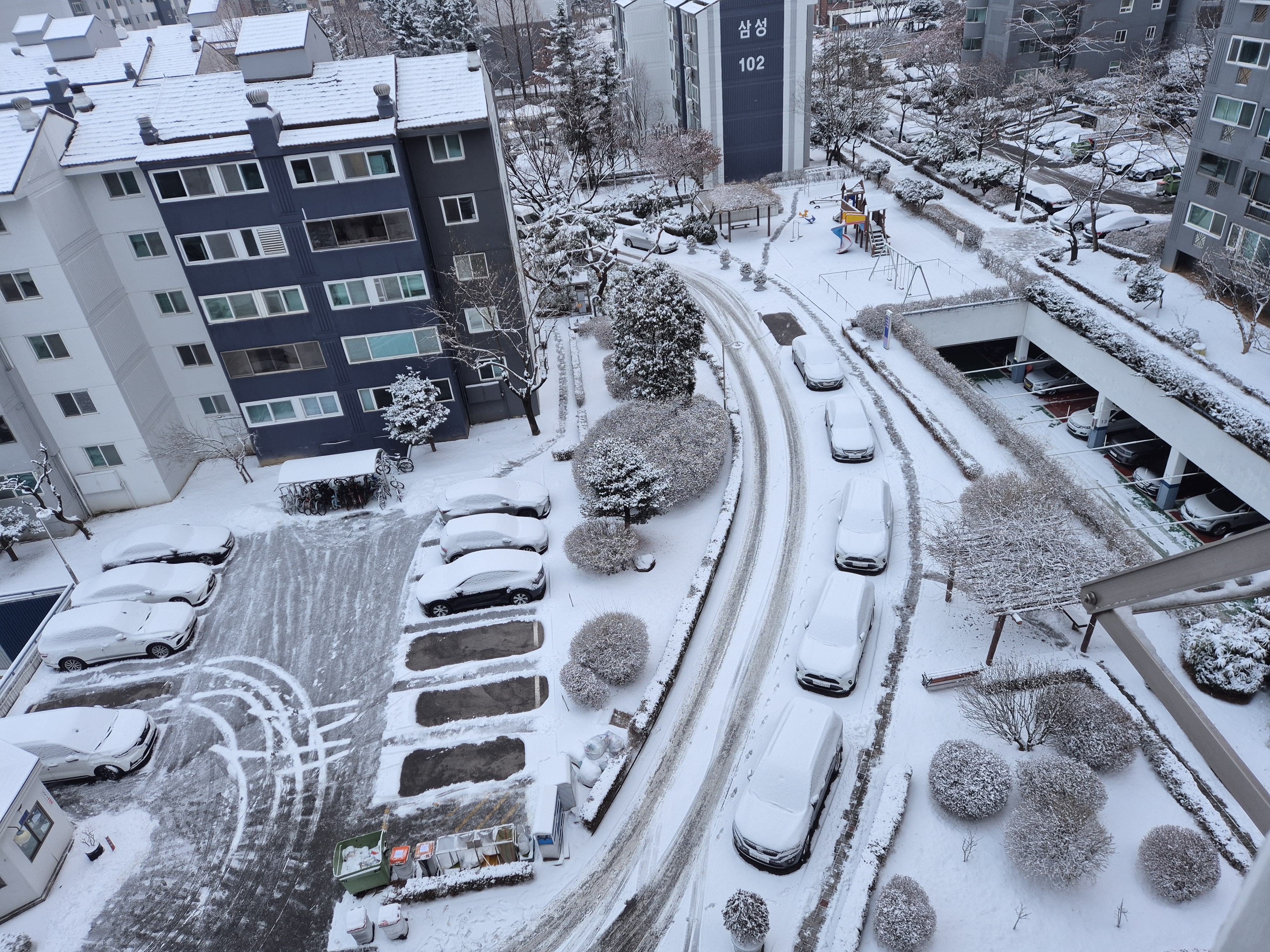 5센티정도의 눈이 쌓인 거리와 더불어 차량을 뒤덮은 눈을 치우느라