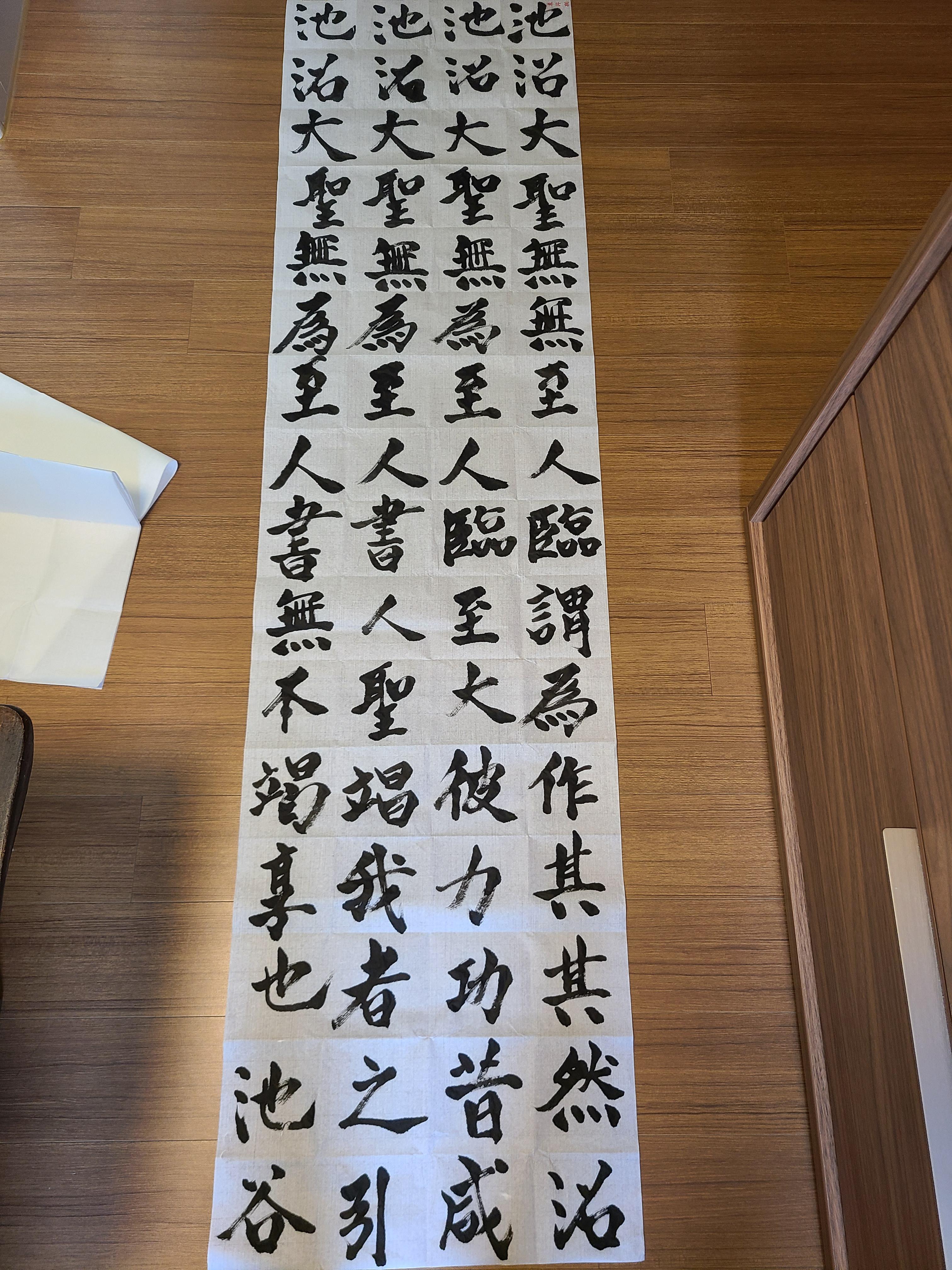 천자문연습3 거의 두달에 걸쳐 192자용 한지 두루마기 2개를 사용하여 소모하였다. 오늘도 오전에 국궁습사후 일산호수공원을 가서 걷고 귀가하여 오후4시에 붓을 잡았는데 2장을 쓰는데 두시간여가 걸린다. 이전처럼 틀려도 수정하지않고 다음글자를 써내려갔다. 써놓고보니 두달전이나 지금이나 별반 차이가 없는 것 같아 갑갑한 마음이다. 언제쯤이면 마음에 드는 글자가 써 질까? 과연 그러한 날이 오기는 올까? 전지가 커서 써야할 글자가 많으니 나중에는 지쳐 집중이 되지않을 경우도 있었다. 이제 내일부터는 조금 작은 한지이니 정성을 들여 한자한자 써나가면서 연습을 하여야겠다. 붓글씨 2021.06.02