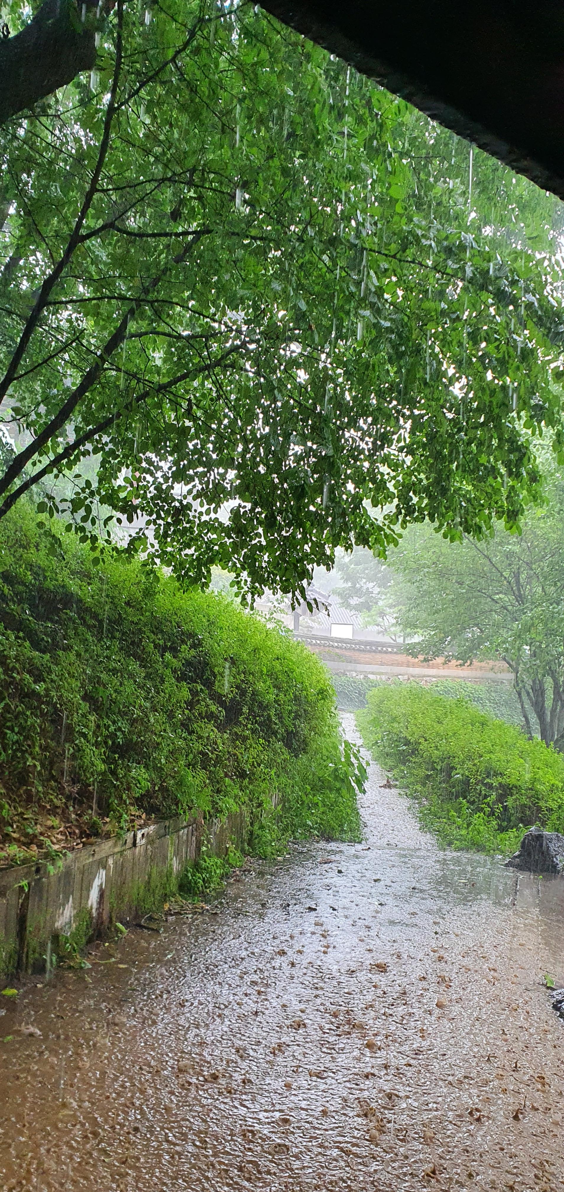 소나기예보가 있음에도 비가오지 않고,도반이 부모님산소를 찾을겸 심학산을 걷자고하니 조식후 집을 나선다. 도중에 처형을 픽업하여 자유로를 달리니 비가 내리다말다를 반복한다. 약천사에 주차를 하니 소나기가 쏟아내리니 배낭을 메고는 정자아래에서 십여분간을 쏟아내리는 비와 흘러내리는 흙탕물을 바라보며 비가 주춤하기를 기다린다. 어느사이 비가 잠잠하니 걷기를 시작하는데 빗줄기가 약해지더니 소강상태로 접어든다. 비옷을 입고 우산까지 받치니 더워서 비옷을 벗고 걸으니 한결 시원하다. 비가와선지 둘레길을 걷는 사람이 드물고 오늘은 평소와 달리 역방향인 약천사 우측방향으로 걷는다. 비는 그치고 촉촉한 산길을 기분좋게 걷는다. 산림에도 비가 내려 나무와 숲이 물길을 잔득 머물고있다. 둘레길의 반정도를 돌아 처갓집선영에 도..