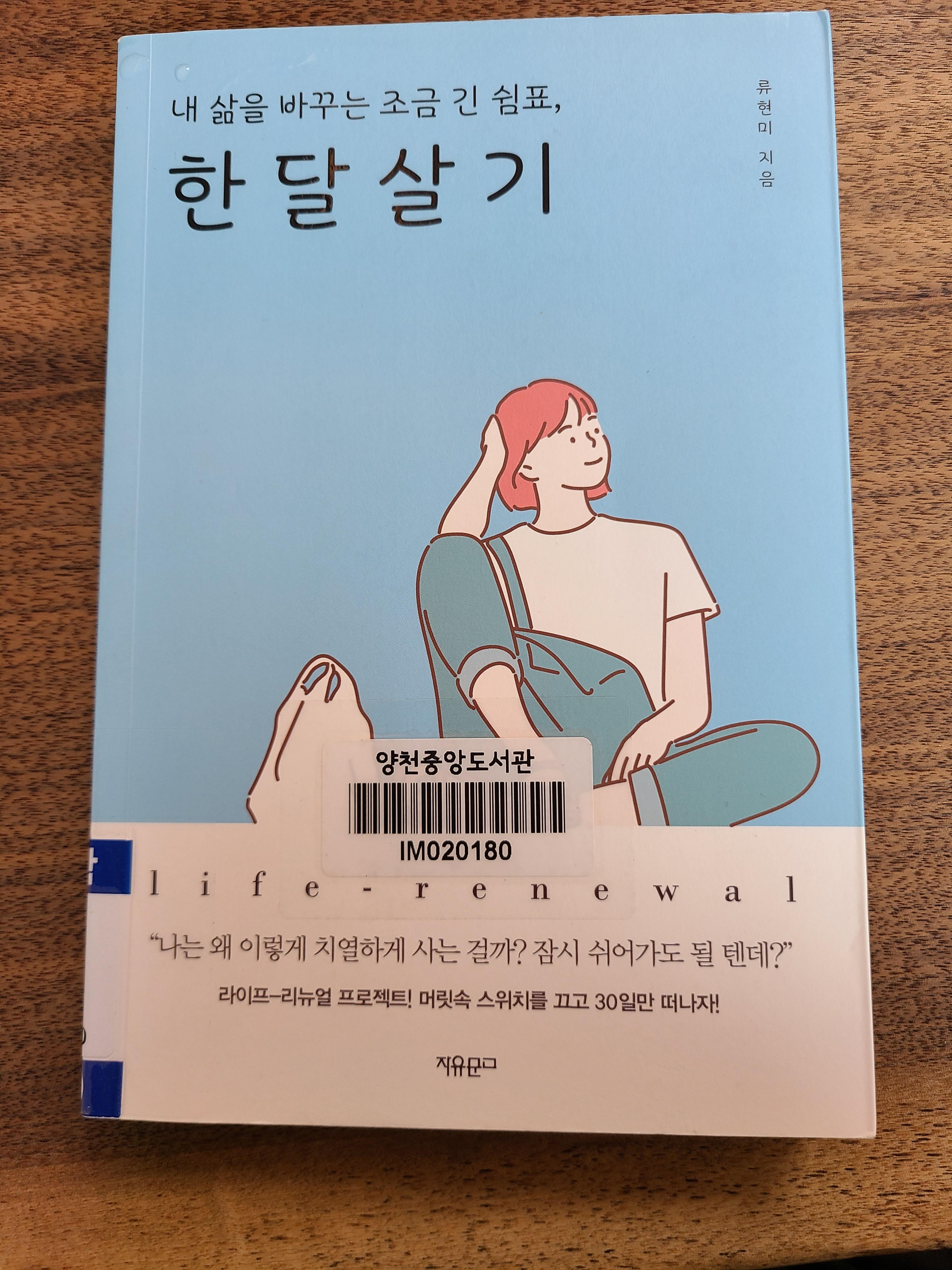 한달살기 내 삶을 바꾸는 조금 긴 쉼표, 한달살기.류현미지음. 제주한달살기를 완료하였고 국내외 다른곳의 한달살기를 추구하고있는데 눈에 띄어 읽은책. '타인의 삶을 사느라고 시간을 허비하지 마십시요'-스티브 잡스 '여행의 가치는 목적지에 닿아야 행복해지는 것이 아니라 여행하는 과정에서 행복을 느끼는 것이다'-앤드류 메튜 '아직은 즐거운 날이 잔뜩 남았습니다' '오늘이 나의 가장 젊은 날이다' '우리의 불행은 대부분 남을 의식하는 데서 온다'-쇼펜하우어 독서 2021.04.28