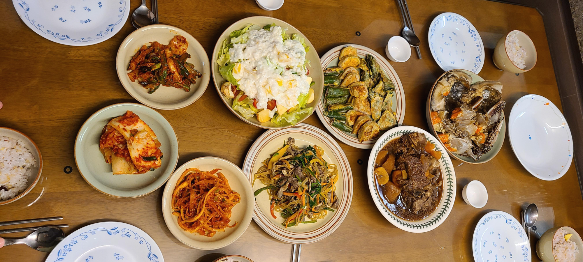 갈비,게장,오징어무침,각종부침개,셀러드,잡채등이 한상 푸짐하게 차려지고 안사돈이
