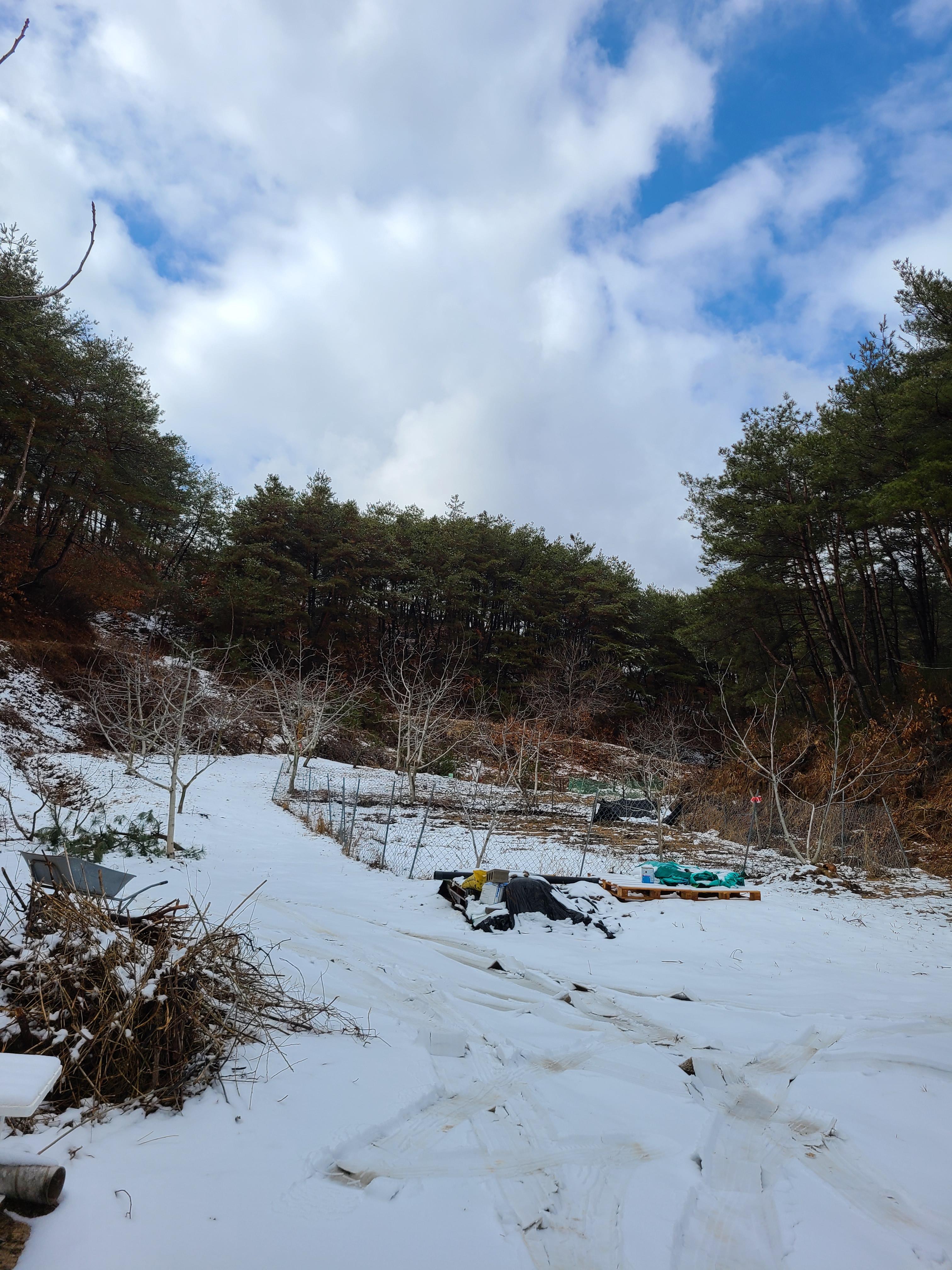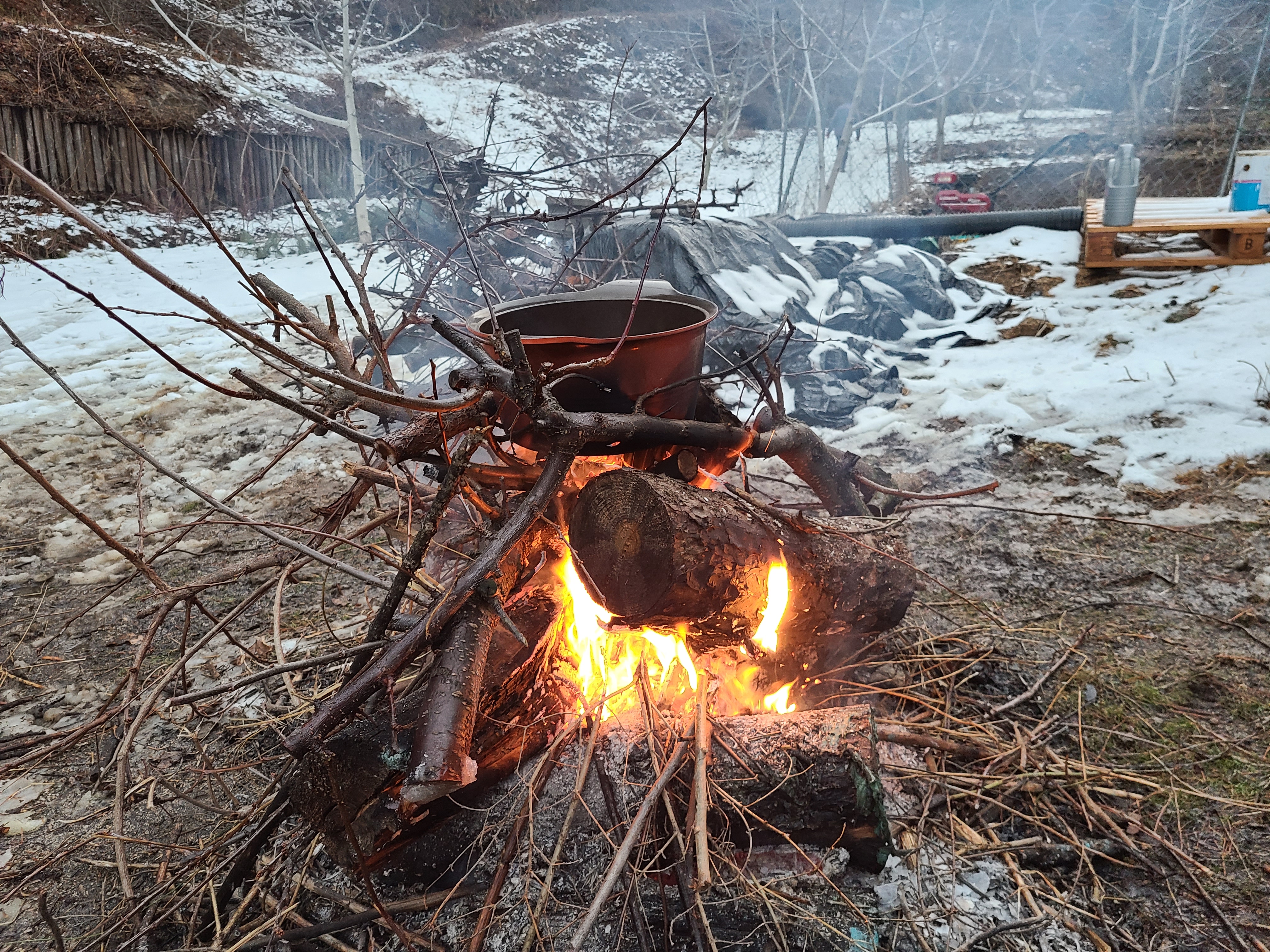 대형물통에 연못의 물을 채우고 불을 피우느라 오후가 지나가고 해가 서산을 넘어서니 기온이 떨어진다.