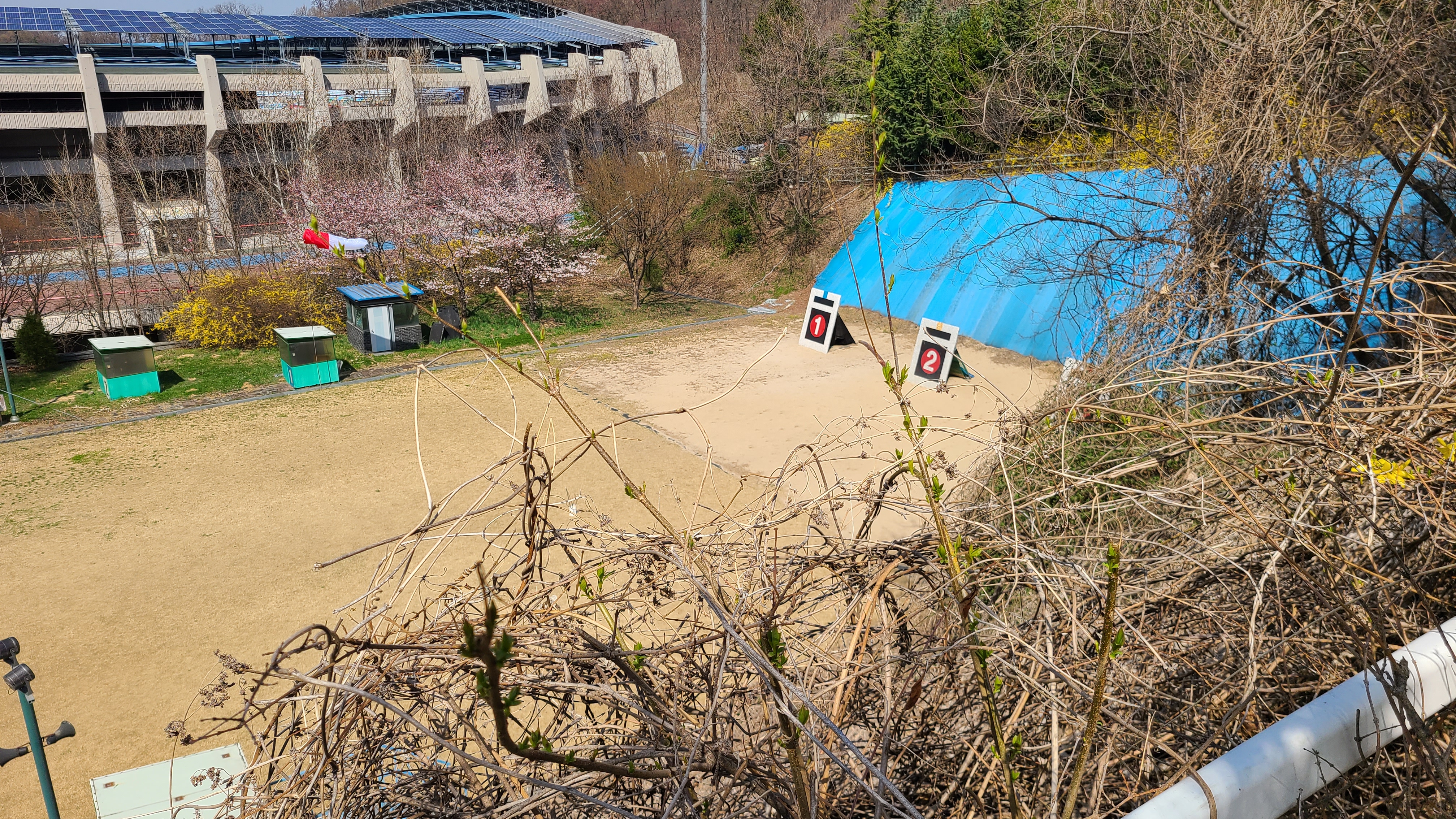 활터가 원미산 자락에 있어 사대에 서면 진달래군락과 구경군들을 볼 수 있는데