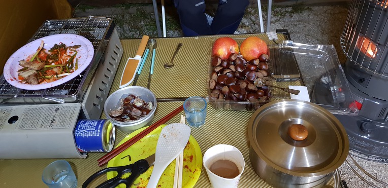 어둠이 깃들면서 서늘함을 넘어 추워져 두터운 윗옷을 입고도 부족해 난로에 불을 피워 가져온 밤과 사온 고구마를