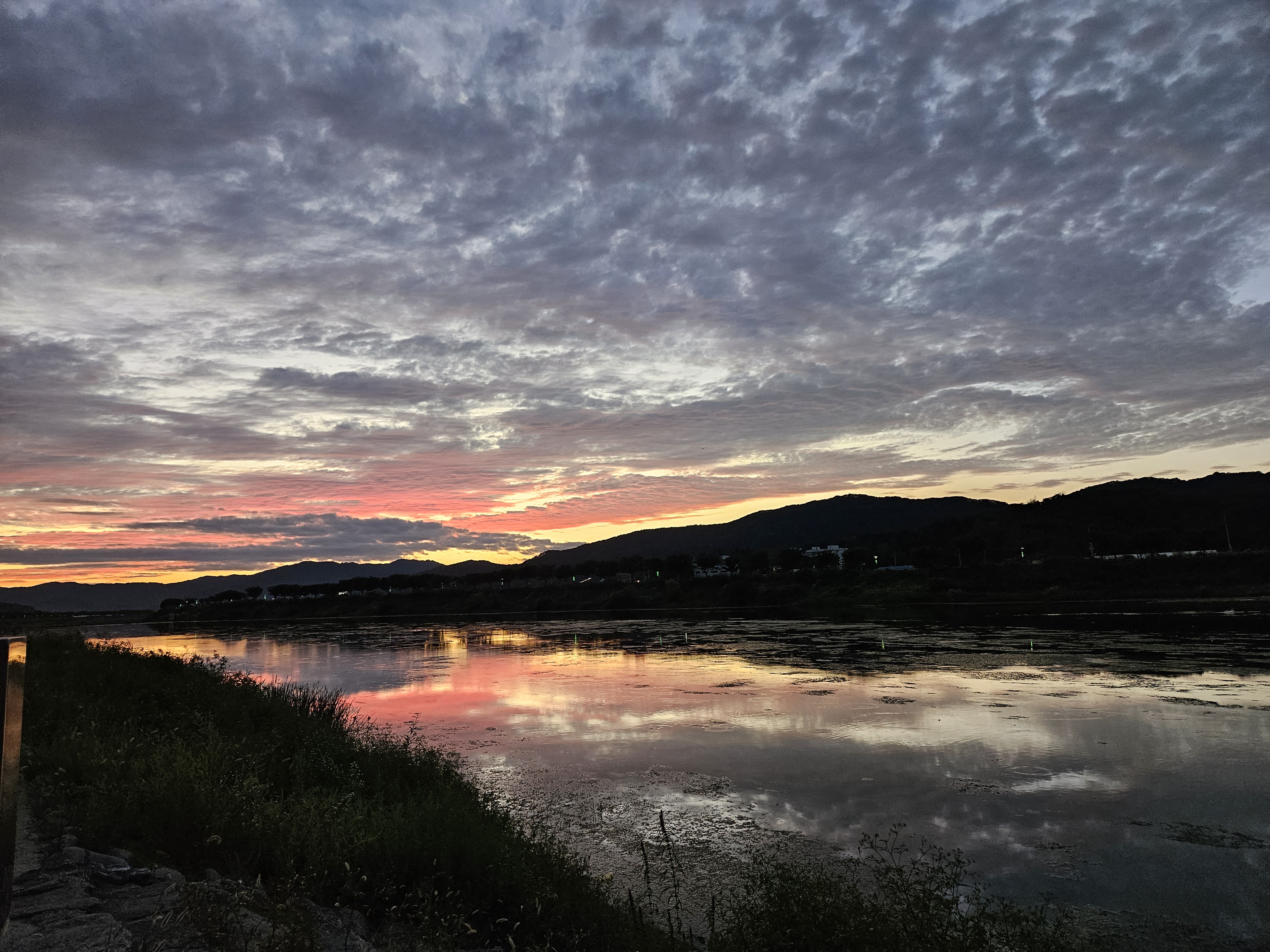 가을이지만 기온이 조금은 더우니 하루살이들이 저녁노을을 받아 떼를 지어 날고있어 조금은 불편하다.