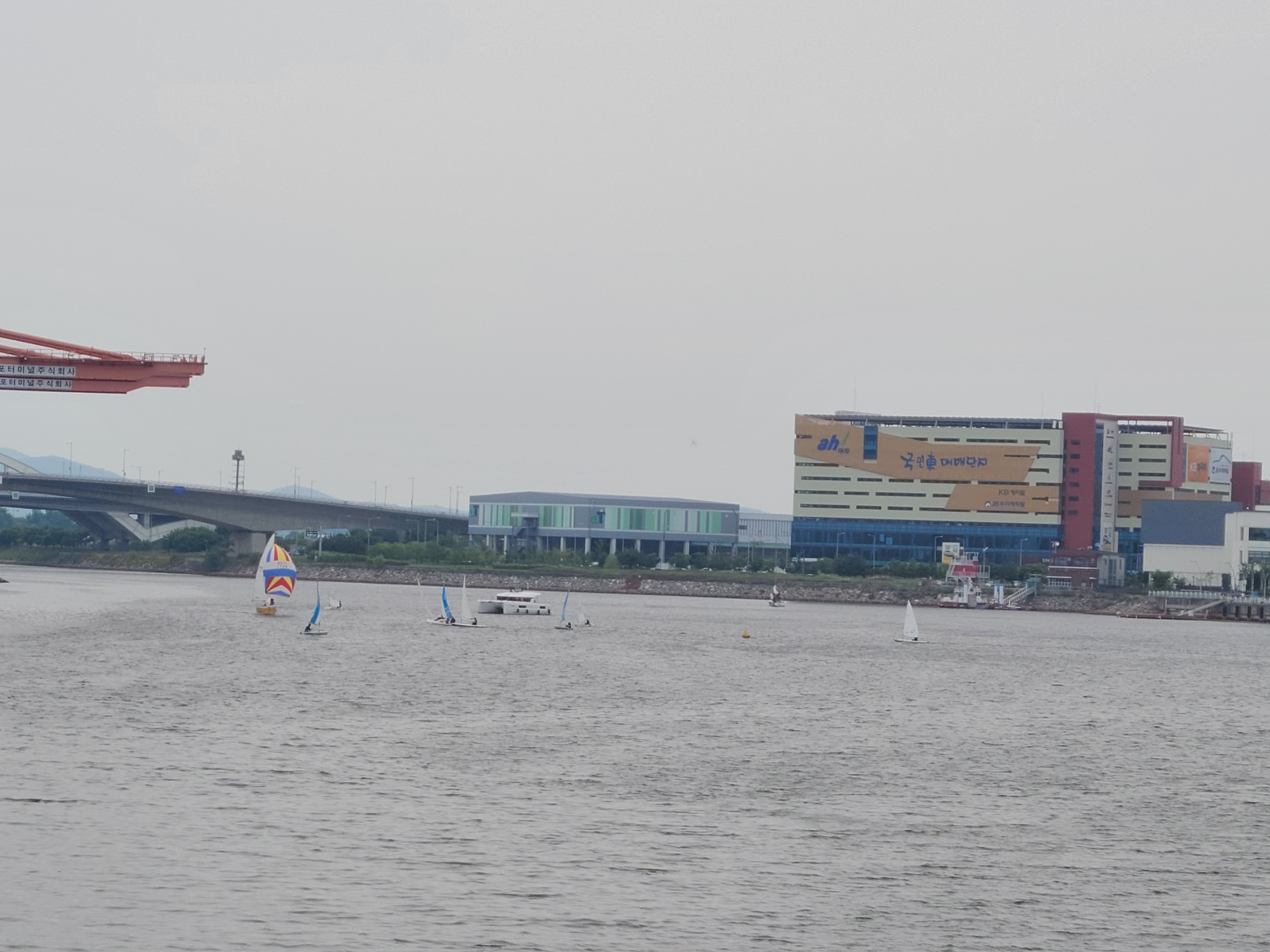 오늘의 목적지인 아라뱃길입구. 많은 숫자의 요트가 서핑을 즐기고 다리아래에서는
