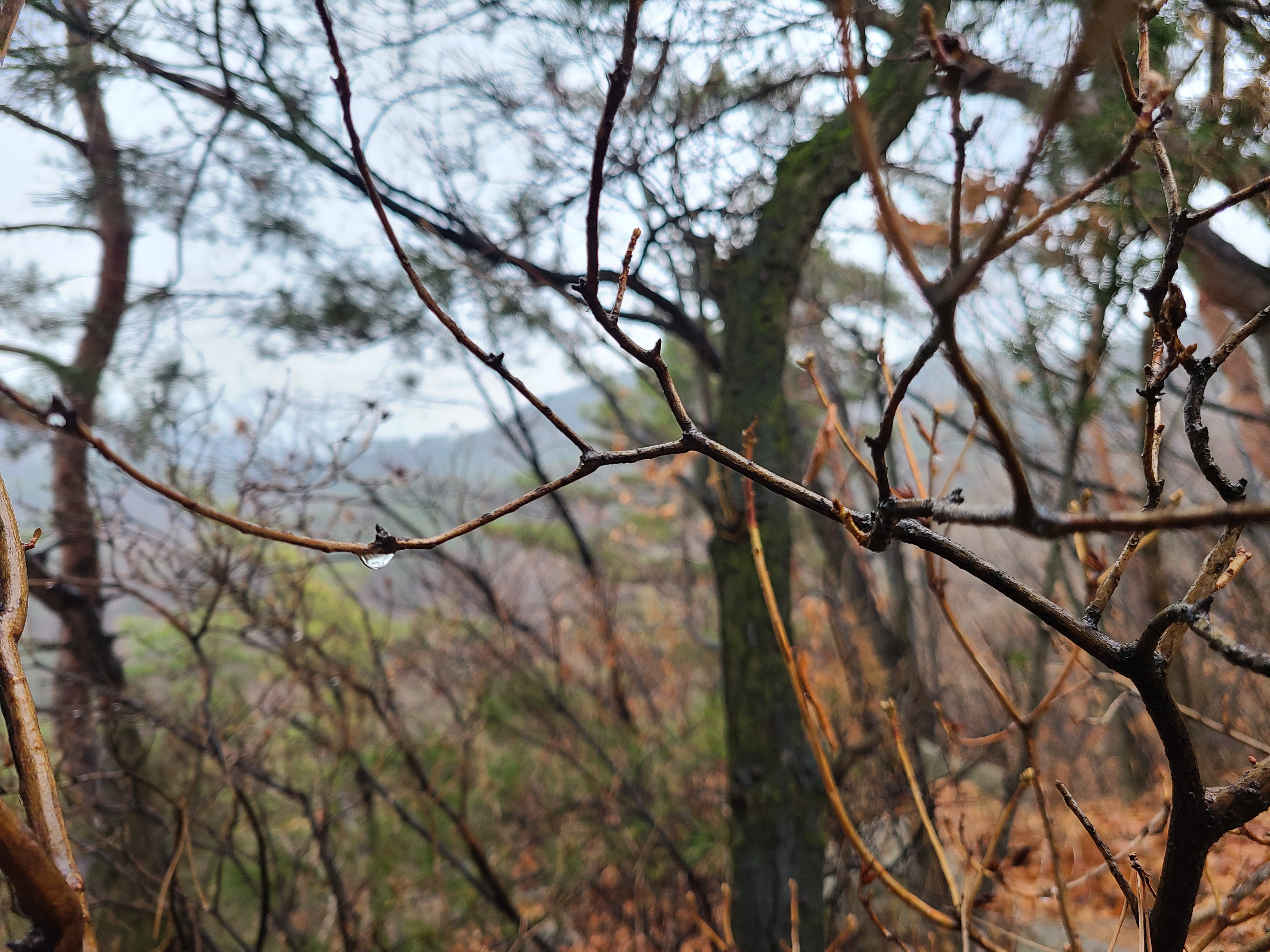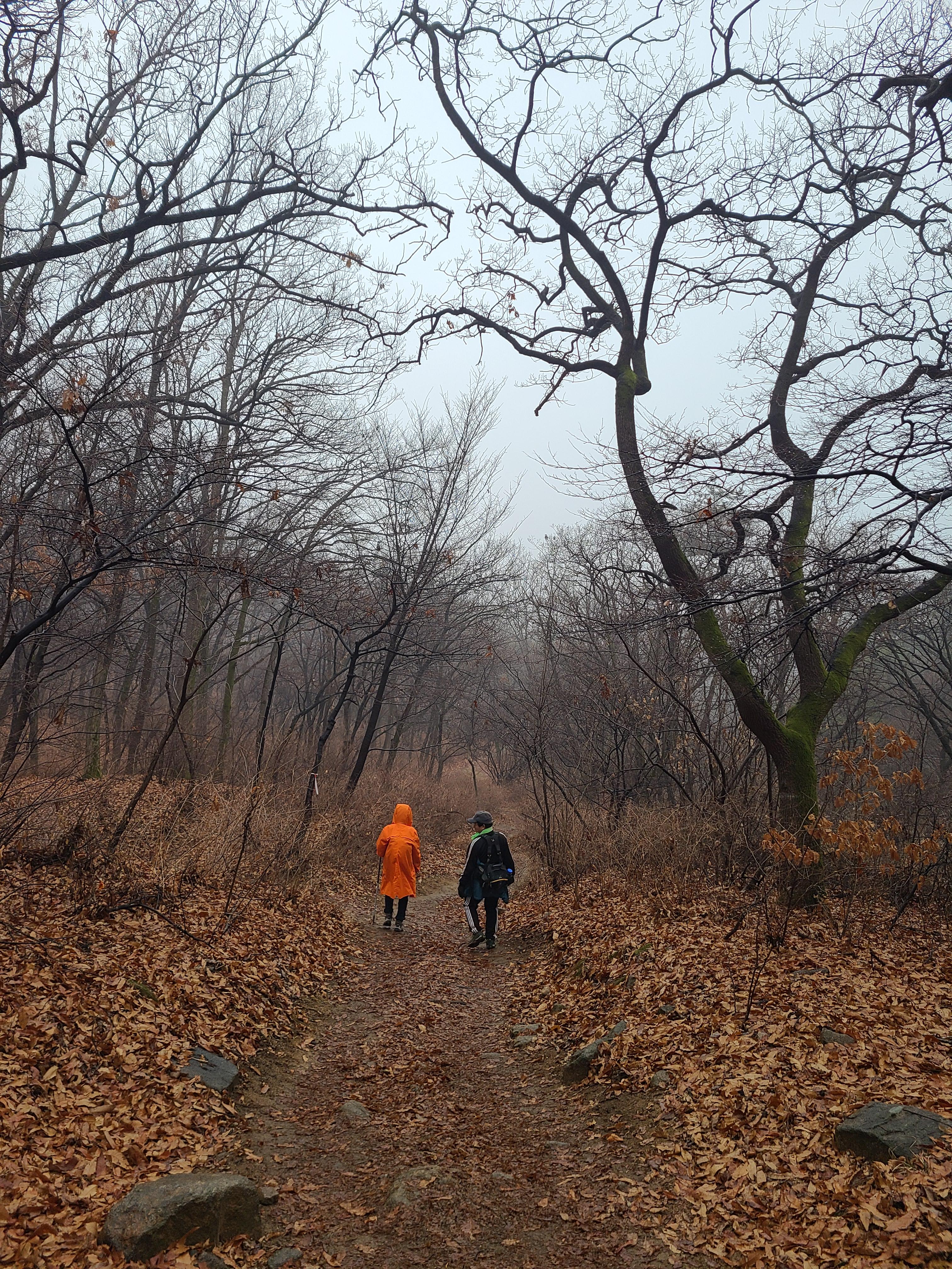 겨울속 우중의 산행이다. 다행히 가랑비 정도의 비가 내리니 우비를 쓰고 우산을 들고는 걷기시작한다.