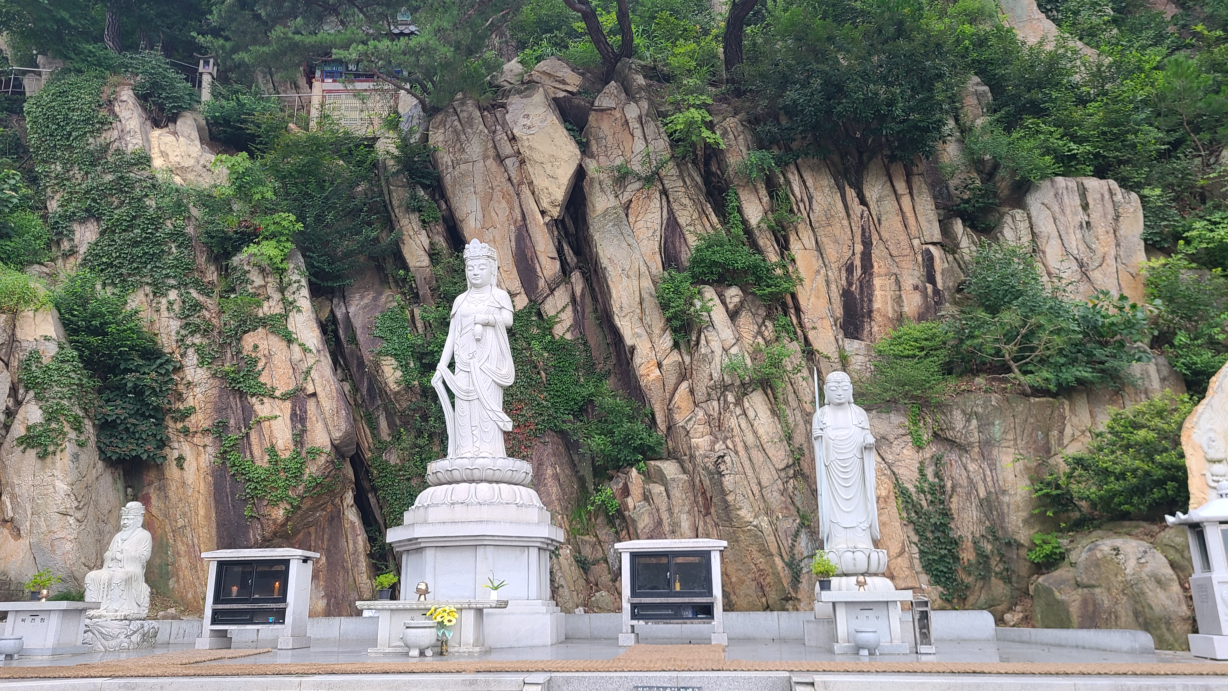 중간의 바위에 걸터앉아 과일을 먹으며 쉬다가 윗옷을 갈아입고 다시 염불암으로 오른다.